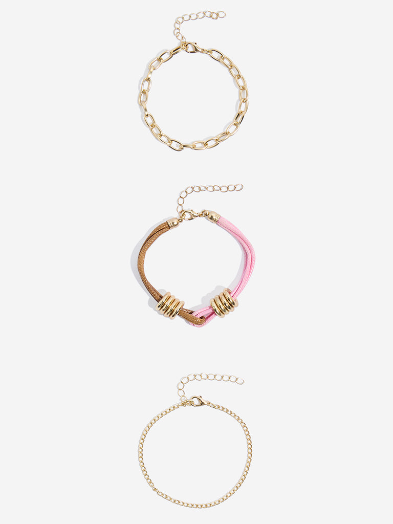 Elevate your accessory game with this set of three gold bracelets from Westside Accessories. The trio includes a chunky chain bracelet. a fine chain bracelet. and a dual-tone corded design in pink and brown. each finished with glossy metallic accents and adjustable clasps. Perfect for stacking or wearing individually. this versatile set adds a stylish edge to both casual and dressy looks.