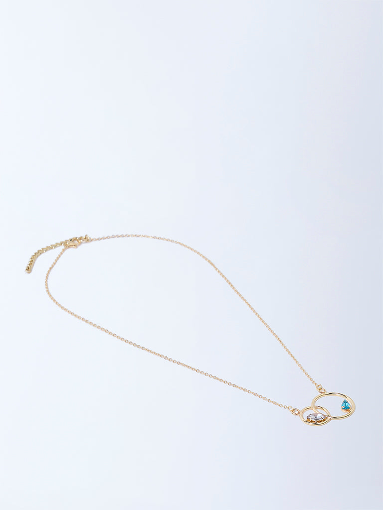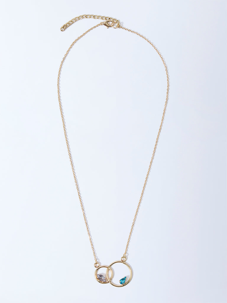 Minimalist yet full of personality. this necklace by Westside Accessories features two interlocking gold rings that hold a mix of colourful. multi-faceted crystals. The delicate chain and subtle pendant make it a perfect everyday accessory. Wear it as a standalone piece for a touch of refined elegance or layer it with other necklaces for a more eclectic look.