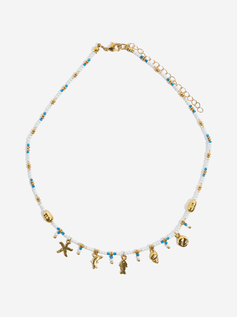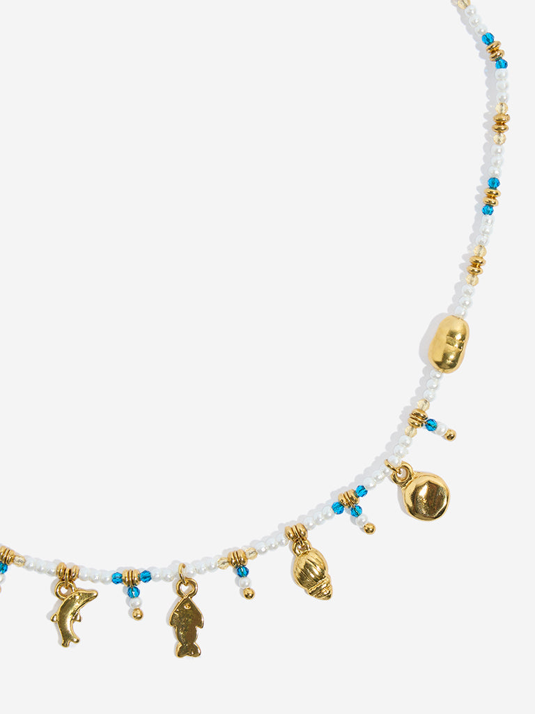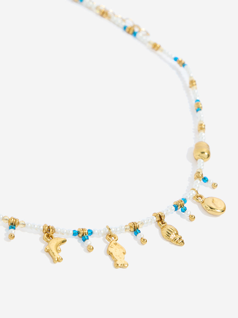 This delicate necklace from Westside Accessories features a fine chain interspersed with white and turquoise-blue beads. punctuated by dainty gold-toned accents. Miniature gold charms??including a starfish. fish. and seashell??bring subtle character to the design. Finished with an adjustable clasp. this necklace adds a refined yet playful detail to your accessory rotation.