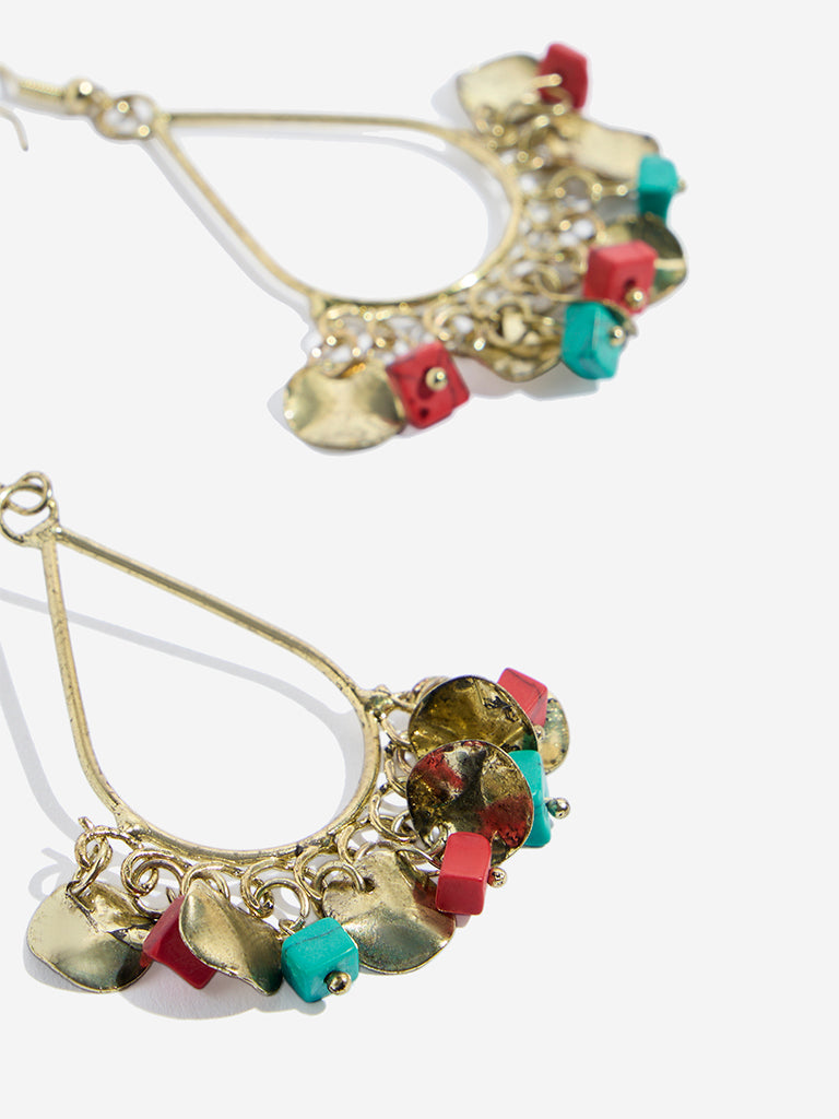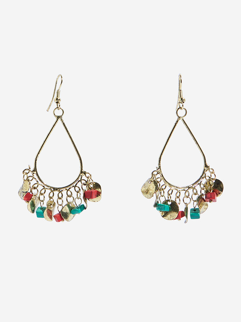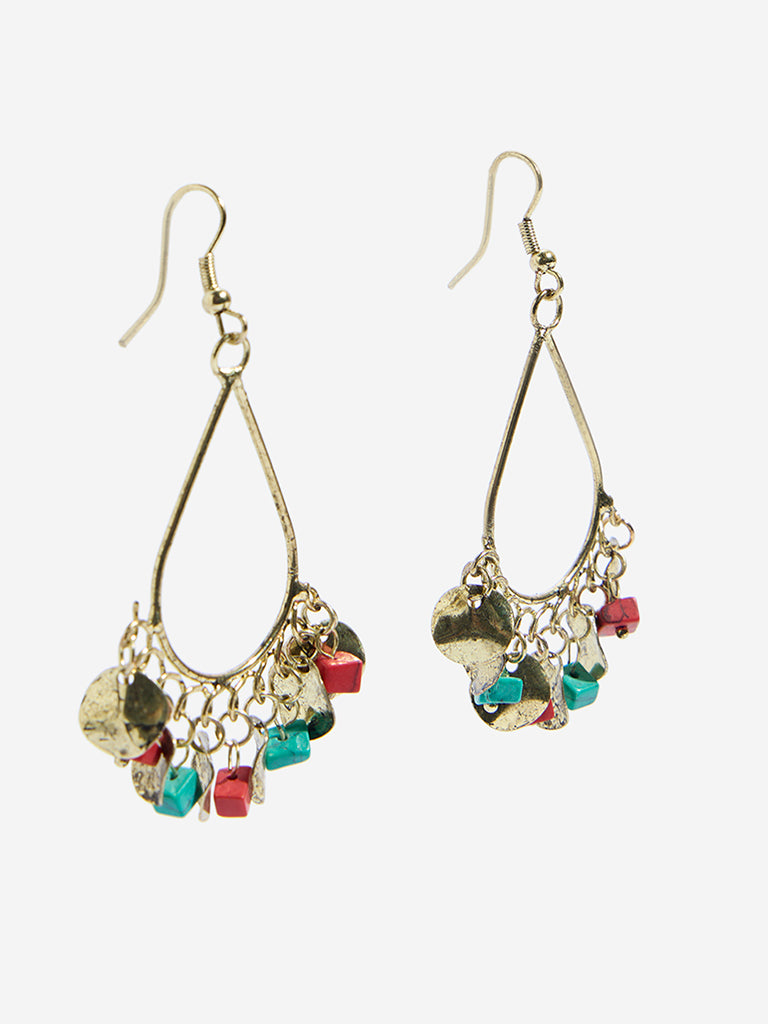 These stylish multicolour drop earrings from Westside Accessories feature a bohemian-inspired design. Each earring consists of a slender. gold-toned metallic piece that extends into a teardrop-shaped frame. Within the frame. there are several small. dangling charms. including textured gold-toned discs and vibrant. square-shaped multicolour and turquoise-coloured stones. The earrings fasten with a fish hook closure. These earrings are perfect for adding a touch of playful colour and movement to any outfit.