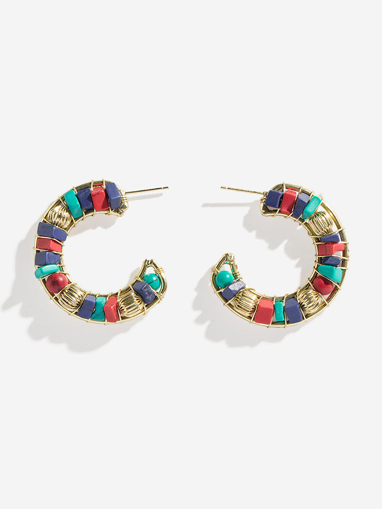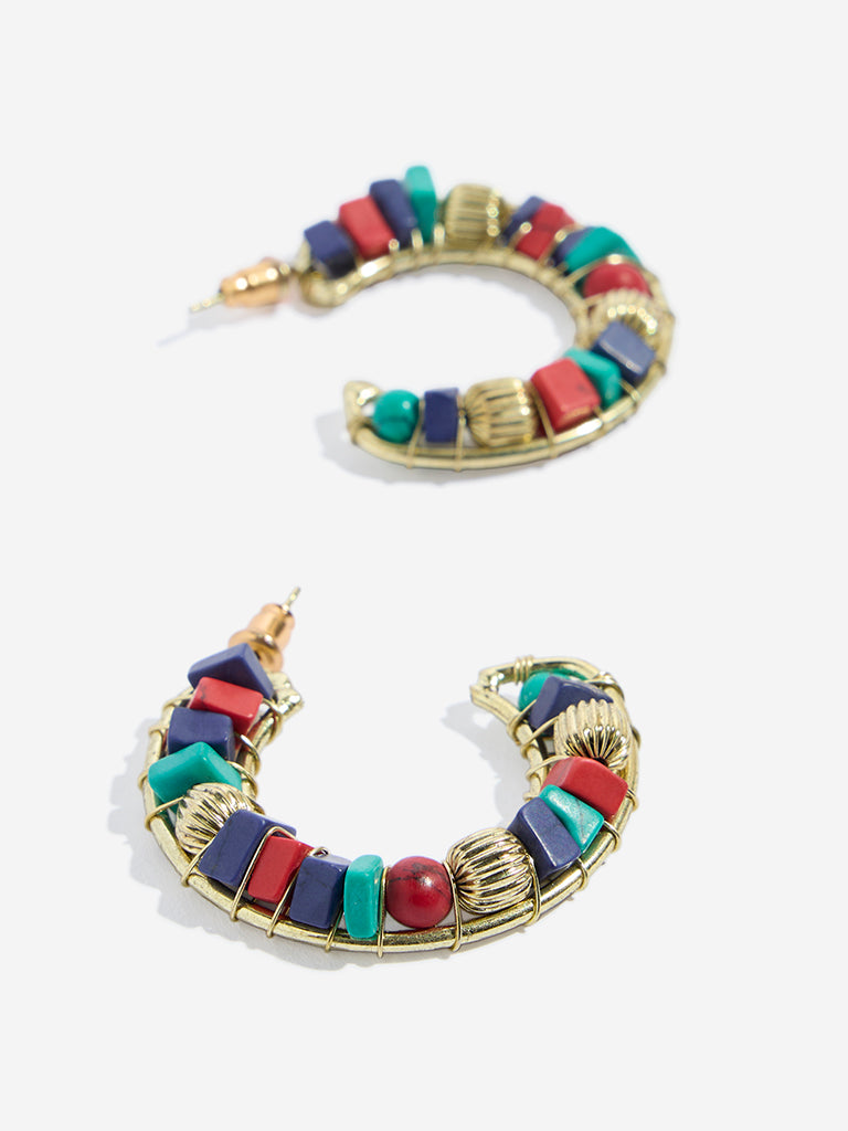 Infuse your look with a vibrant bohemian spirit with these gold-toned earrings from Westside Accessories. Each earring curves into a captivating semi-circle. brought to life with a mosaic of richly hued gemstones. Discover the allure of multicolour. the vibrancy of turquoise. and other dazzling shades. all nestled within an intricate gold-toned wire setting. These textured beauties fasten securely with a post and back. promising comfortable wear.