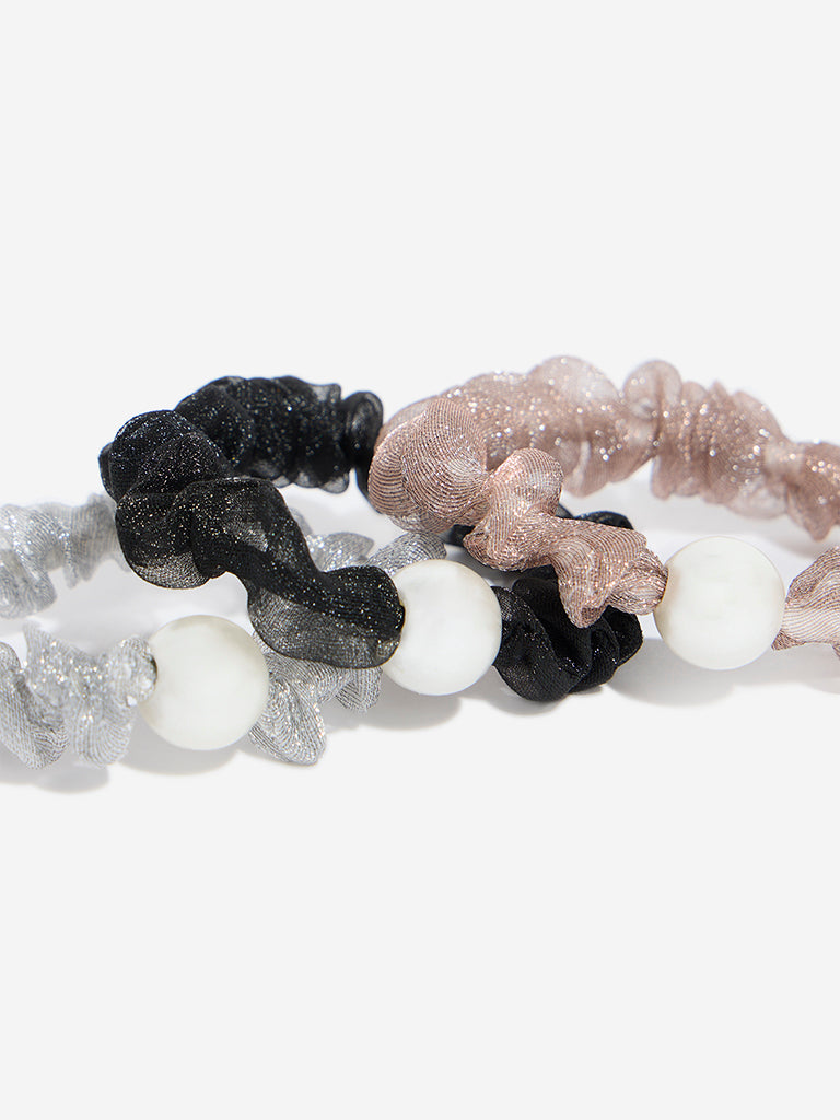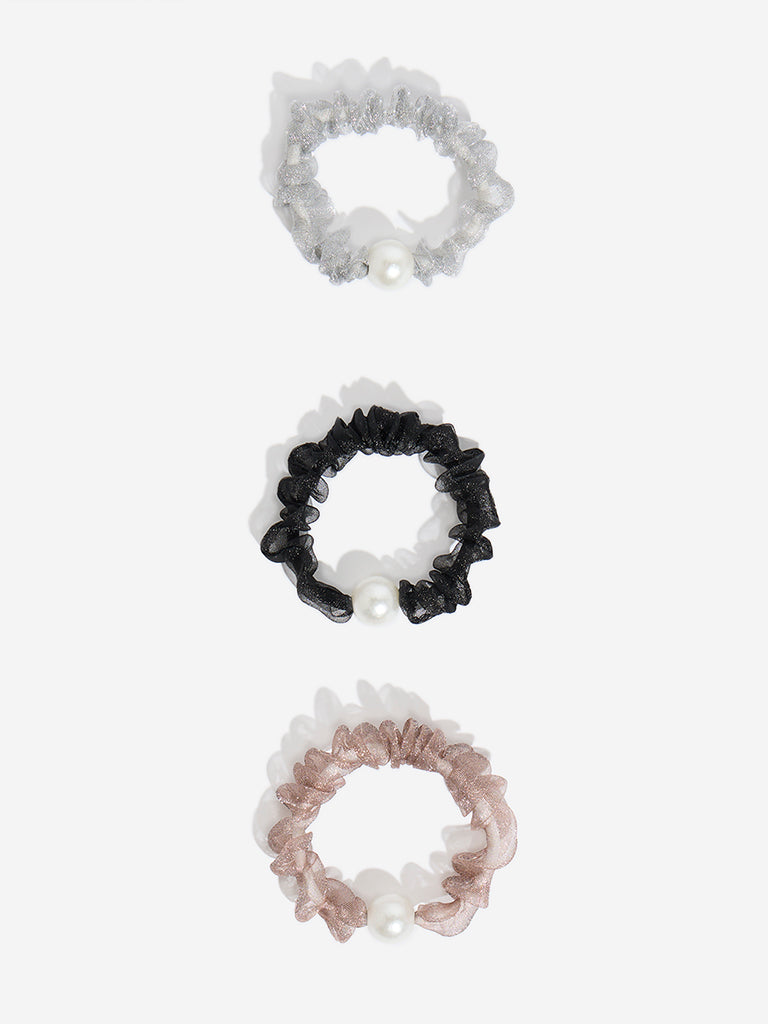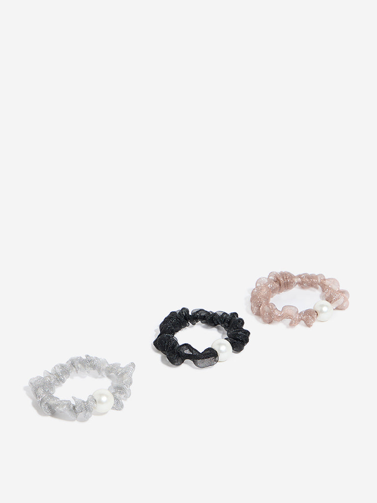 Westside Accessories introduces this multicolour set of three scrunchies. These flaunt a glitter design with a with a big pearl embellishment. Pick from these three small and stylish bands to add a touch of elegance to your outfit.