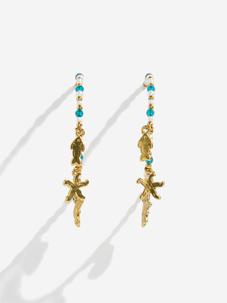 These half-hoop earrings from Westside Accessories feature a gold-toned base embellished with a vibrant mix of elements. Suspended from the hoop are clusters of gold beads. smooth white faux pearls. and turquoise-blue accents. alongside sea-inspired charms like miniature fish. starfish. and seashells. Designed with a secure post-back closure. this pair offers a comfortable fit and adds a playful. coastal touch to your accessory collection.