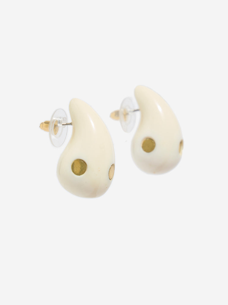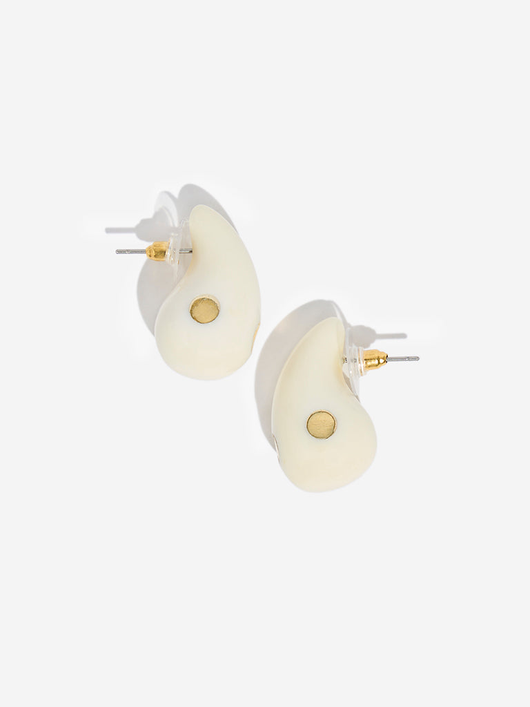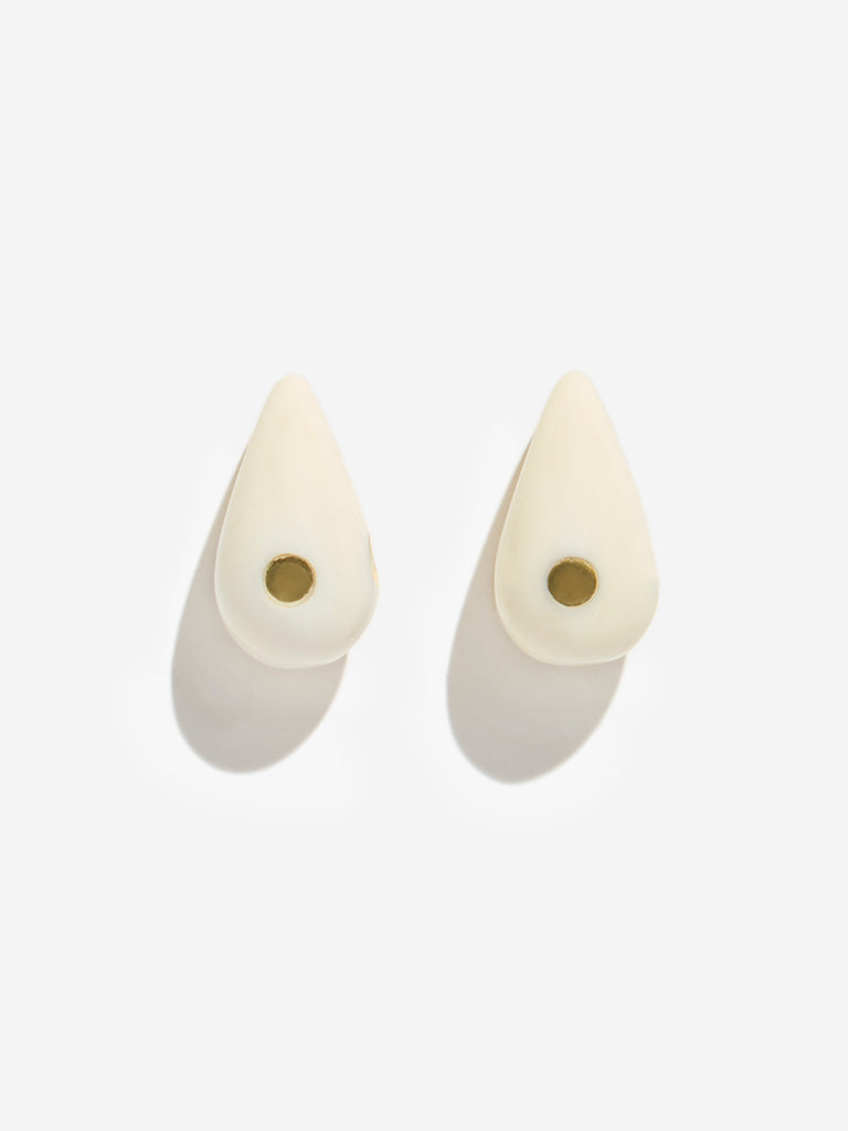 These off-white stamped drop earrings from Westside Accessories offer a clean. sophisticated accent to any outfit. Crafted from smooth. glossy resin in a sleek teardrop shape. each piece features a subtle circular indentation with a gold-toned centre that adds just the right hint of detail. Finished with a post-and-butterfly closure. these earrings blend minimalism with modern elegance for an effortlessly polished look.