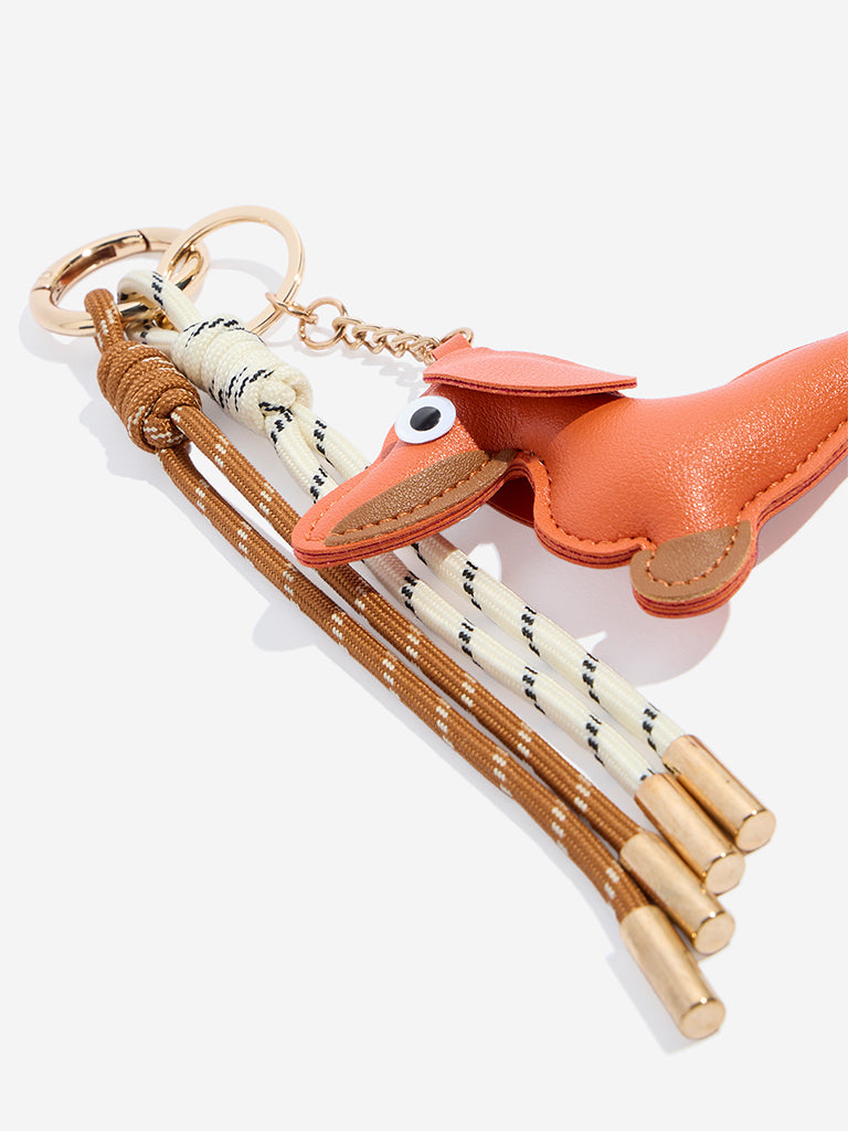 Bring a hint of personality to your accessories with this fun dog-shaped bag charm from Westside Accessories. Cast in an orange hue and secured to a polished gold-toned keyring. the playful silhouette comes with two braided cords. The mix of textures and colours creates a tactile contrast. making this piece a unique accent that elevates your everyday carry with charm and character.