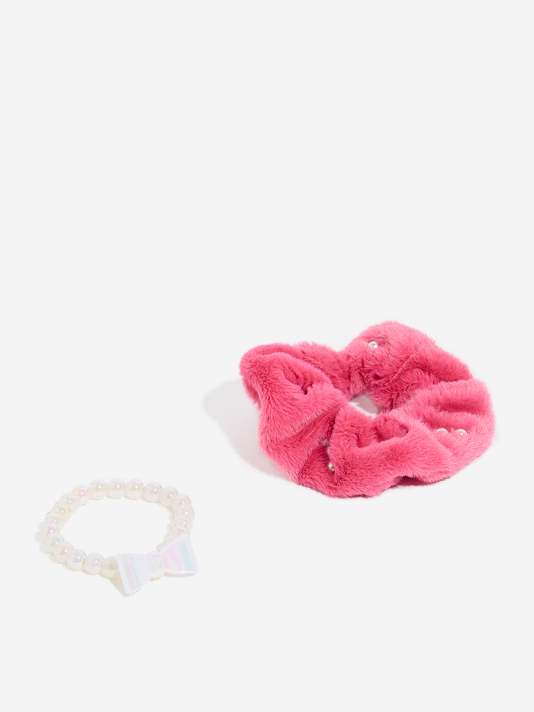 This set of two scrunchies Westside Accessories flaunts hues of pink and ivory. Its ruffled design faux-fur construction is embellished with pearls for a touch of elegance. While a pearl beaded Scrunchie with a ribbon-design centre balances out this vibrant set.