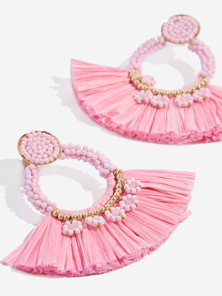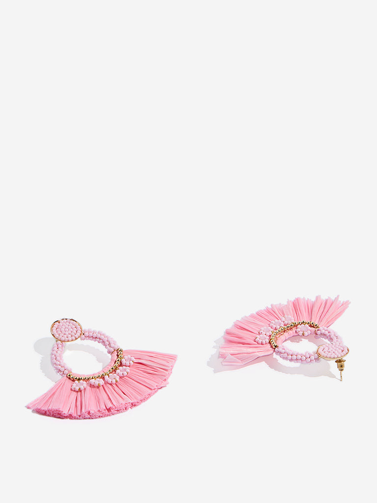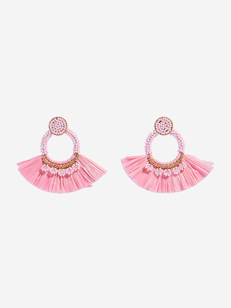 Westside Accessories presents these pink raffia earrings. crafted in a semi-circular design with soft. light pink fringe. Embellished with white and gold-toned beads. they bring texture and a playful touch to your look. The design is finished with a coordinating white beaded stud that ties the whole piece together.