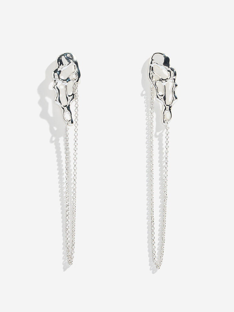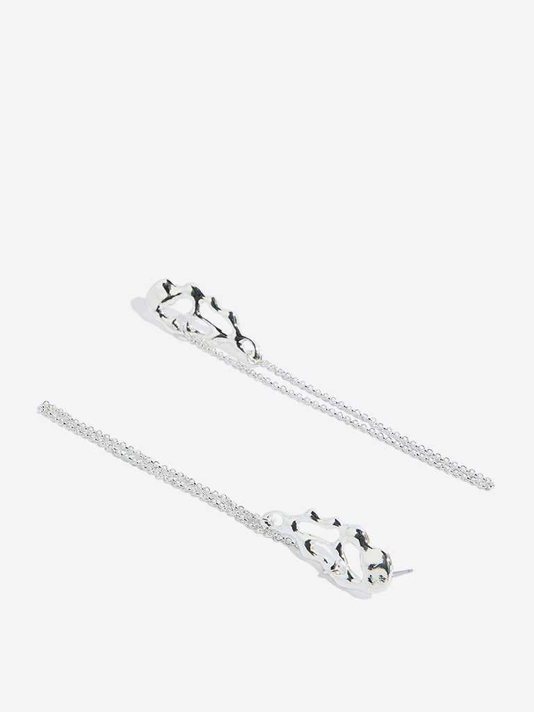 These dangler earrings from Westside Accessories showcase a modern. abstract design with a high-shine silver finish. Featuring molten-style studs that evoke fluid metal forms. the sculptural look is complemented by two delicate chain strands that cascade gracefully. adding movement and depth. With their minimal yet striking presence. these earrings effortlessly elevate eveningwear or add a contemporary touch to casual ensembles.