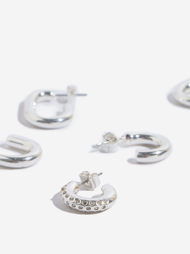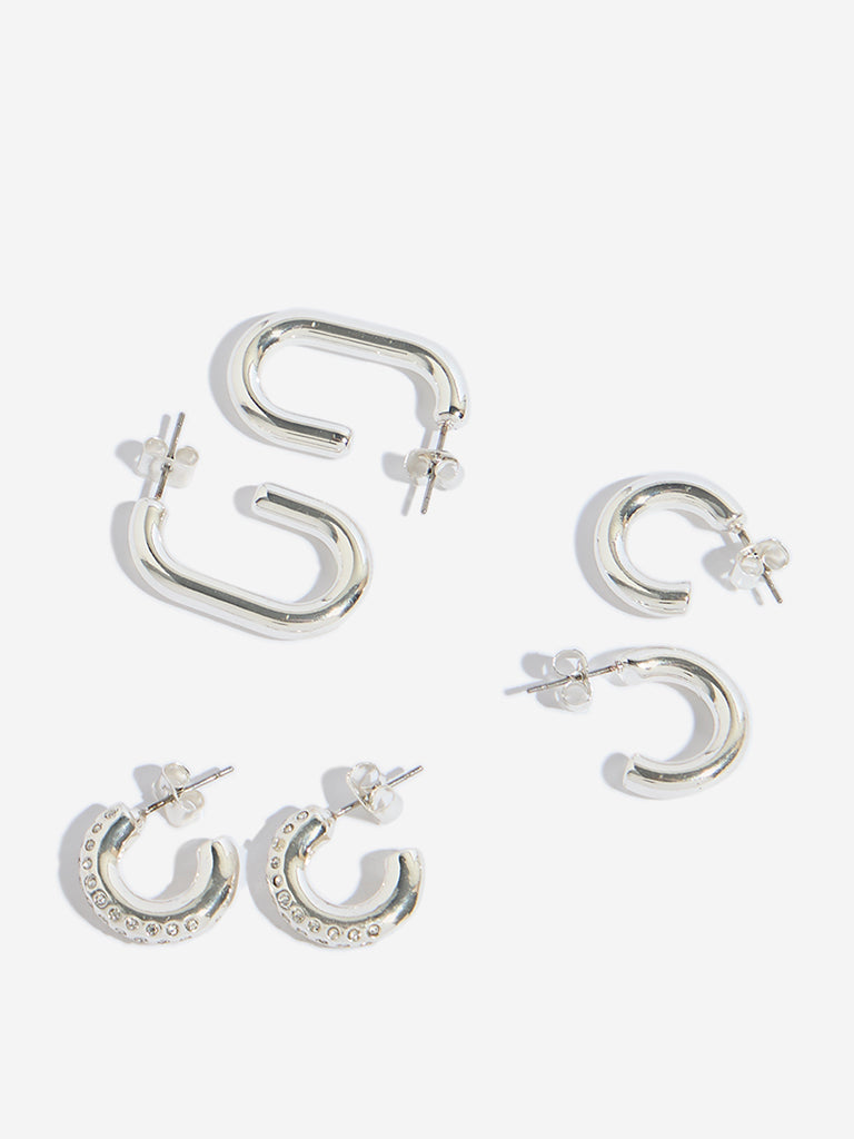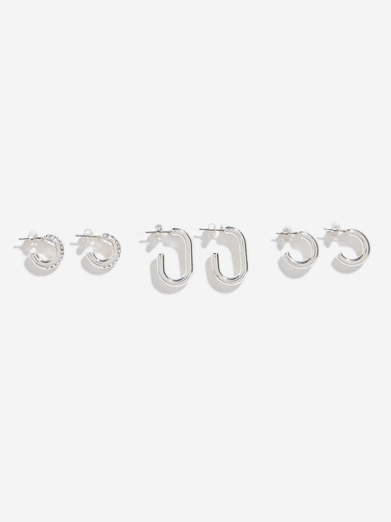Westside Accessories brings you this trendy silver earring set – featuring three earrings with impressive designs. It includes two sleek pair of earrings in rectangular and half hoop structure. respectively. The third pair of half hoop earrings flaunt studded addition of clear gemstones.