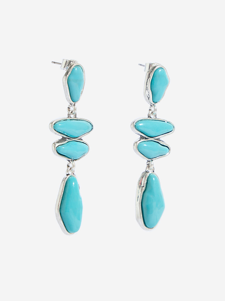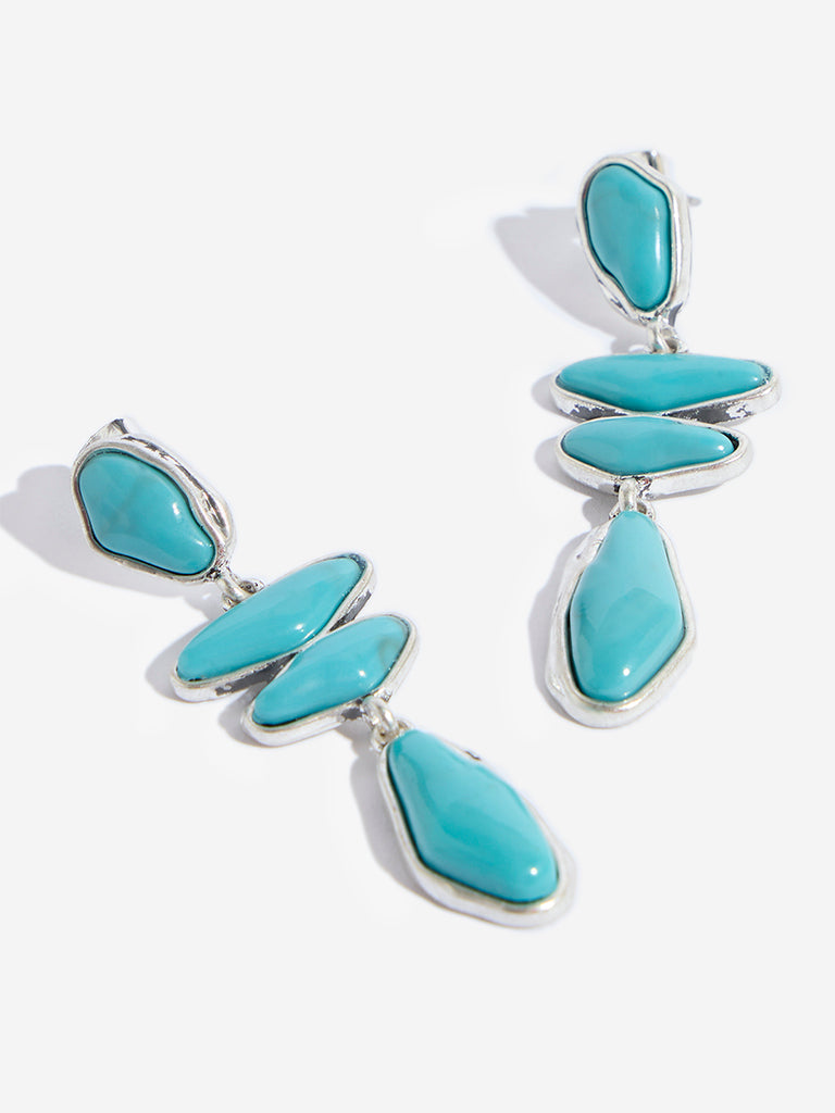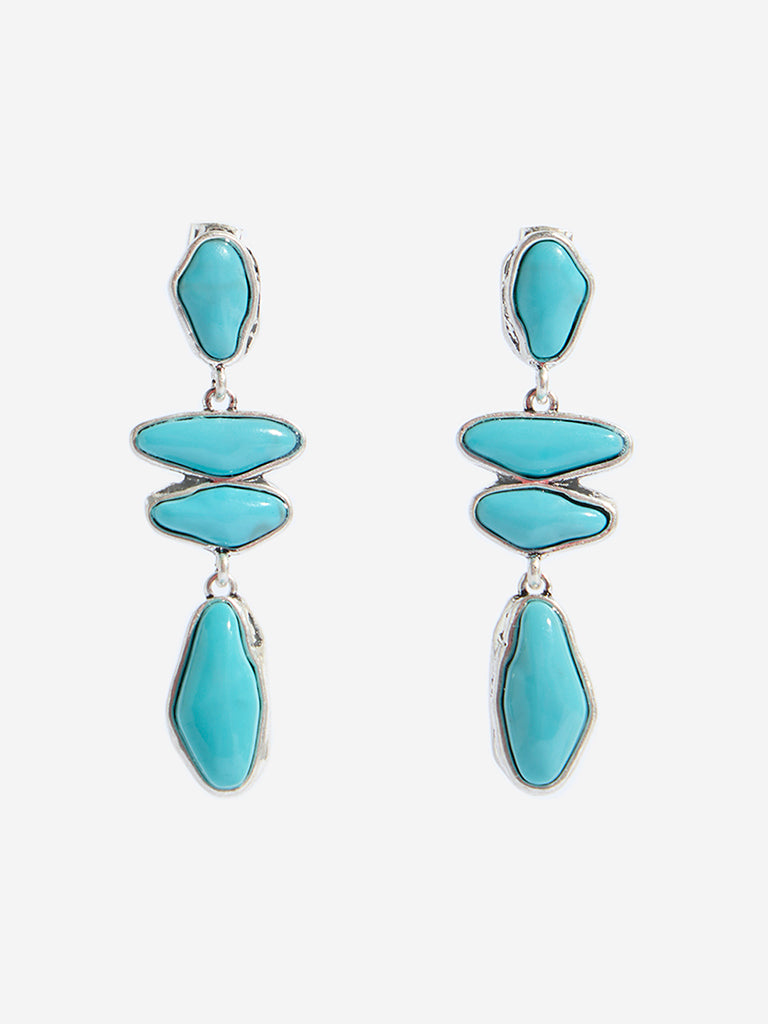 Westside Accessories launches these striking dangler earrings. showcasing a cascading arrangement of polished turquoise-coloured stones. each uniquely shaped and encased in sleek silver-toned bezels. The stones are linked with fine silver-toned connectors. allowing for graceful movement with every step. Secured with a post backing. this pair offers a fluid silhouette and vibrant charm??perfect for making a refined statement.