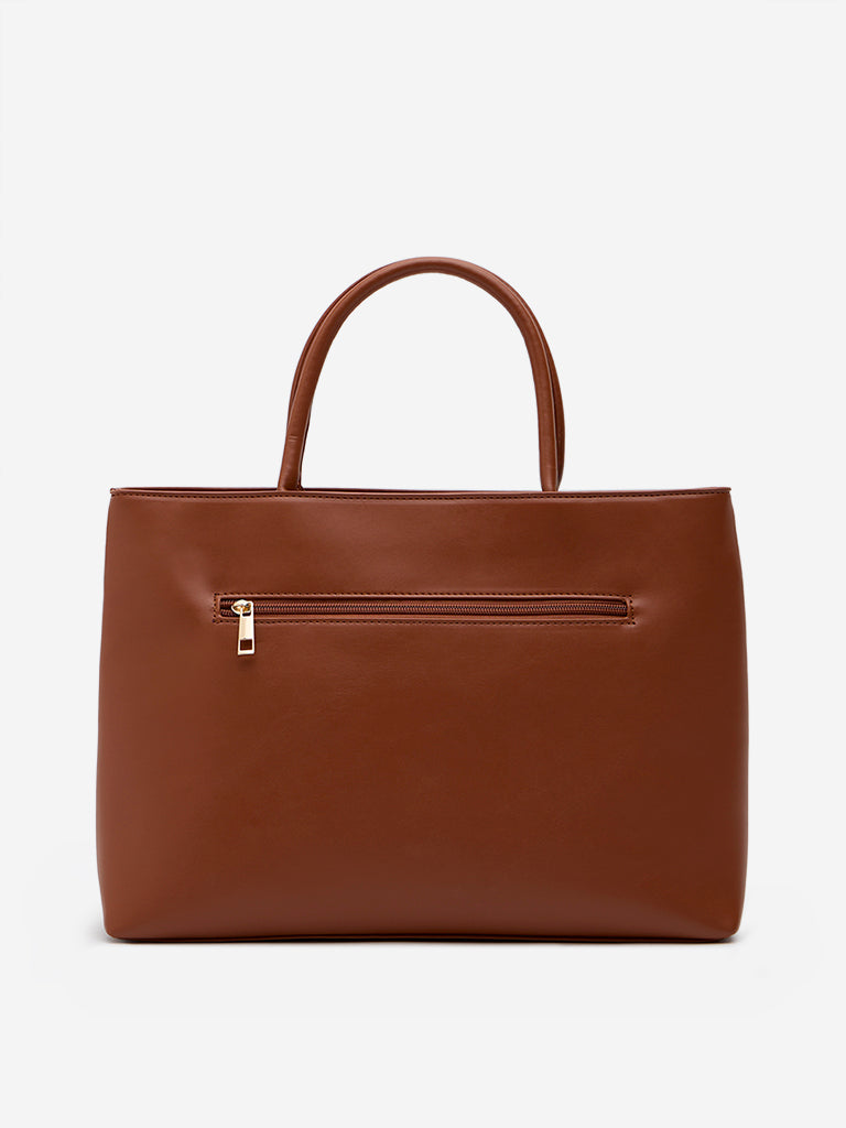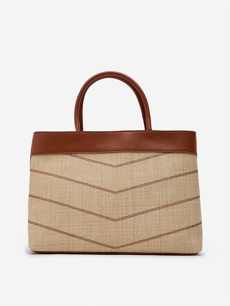 Upgrade your accessory collection with this beige and brown hand bag from by Westside. The front showcases a chic jute texture. while the faux leather back adds a refined touch. Designed for functionality. it offers a ziplined compartment. multiple inner pockets. and an exterior pocket. The sturdy round handle ensures convenient carrying.