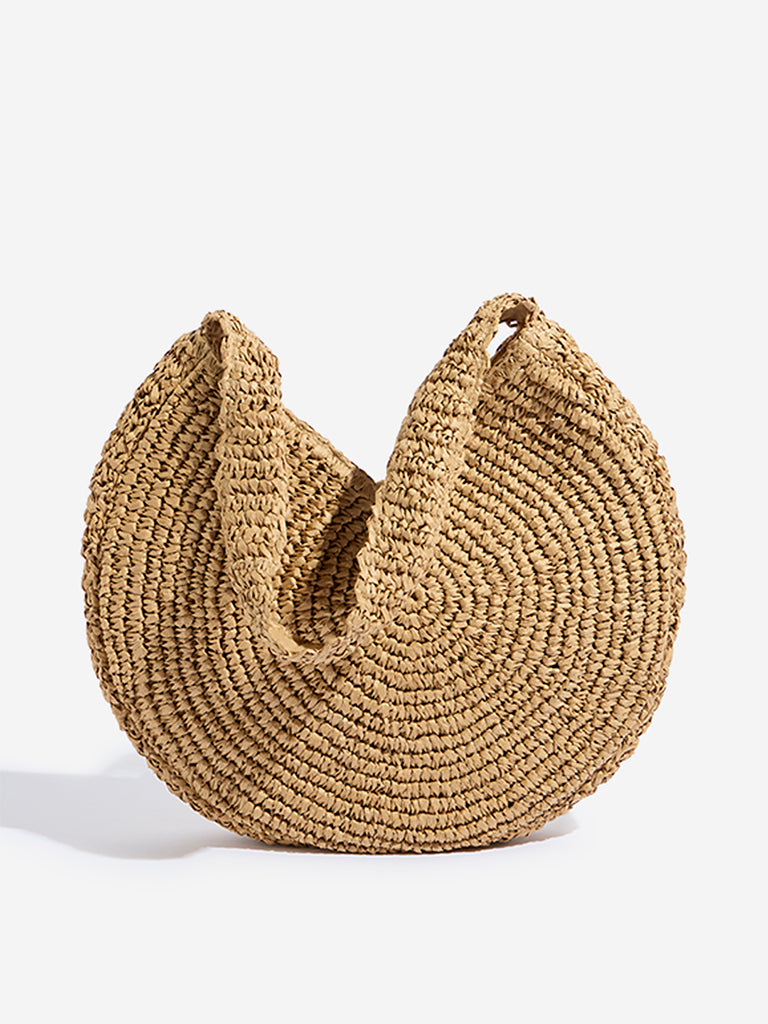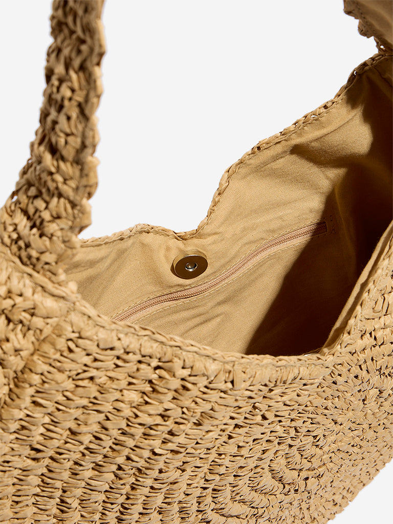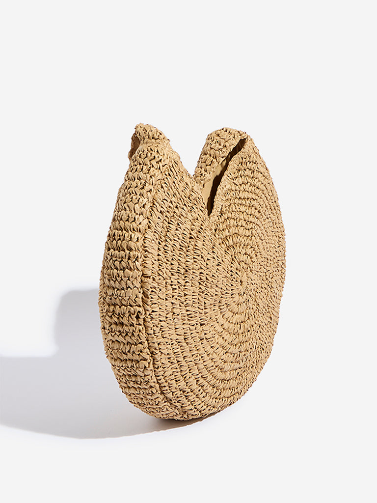 This beige woven shoulder bag from Westside features a unique crescent shape. offering both style and practicality. Crafted from natural-looking woven material. it has a sturdy handle for easy carrying and a secure snap closure. The spacious. lined interior provides ample room for essentials. making it a versatile choice for everyday use or special occasions.