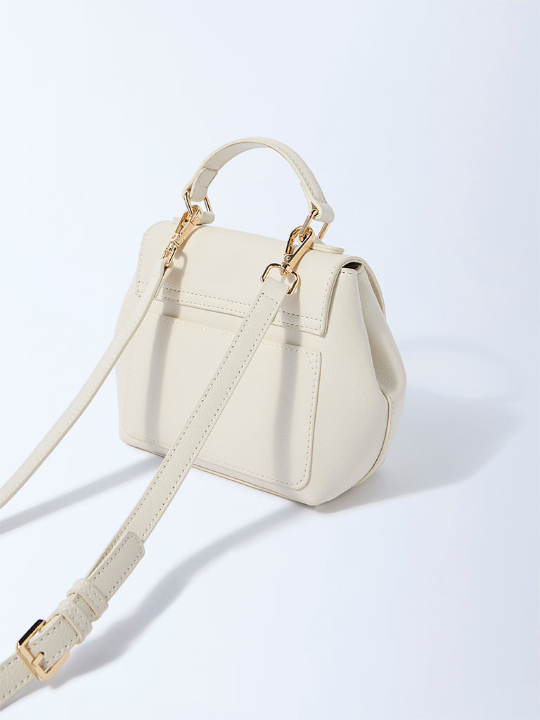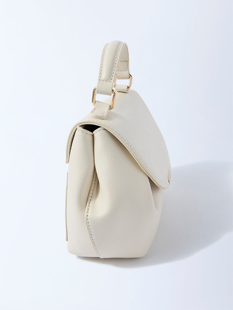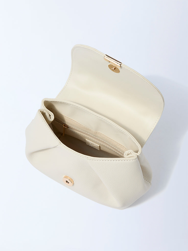 An elegant update from Westside. this beige potli sling bag brings quiet luxury into everyday style. Crafted with a structured silhouette. it features a softly curved flap. gold-tone hardware. and a detachable shoulder strap for versatile wear. The minimalist palette and sculpted form make it an effortless pairing for work or weekend edits alike.
