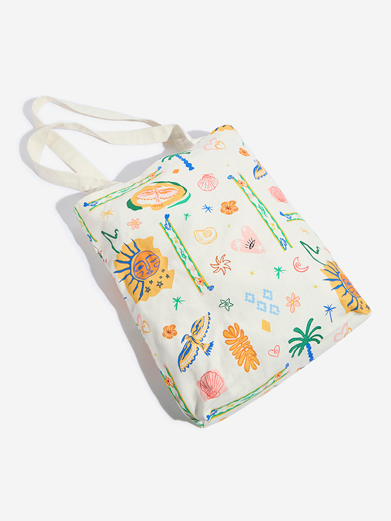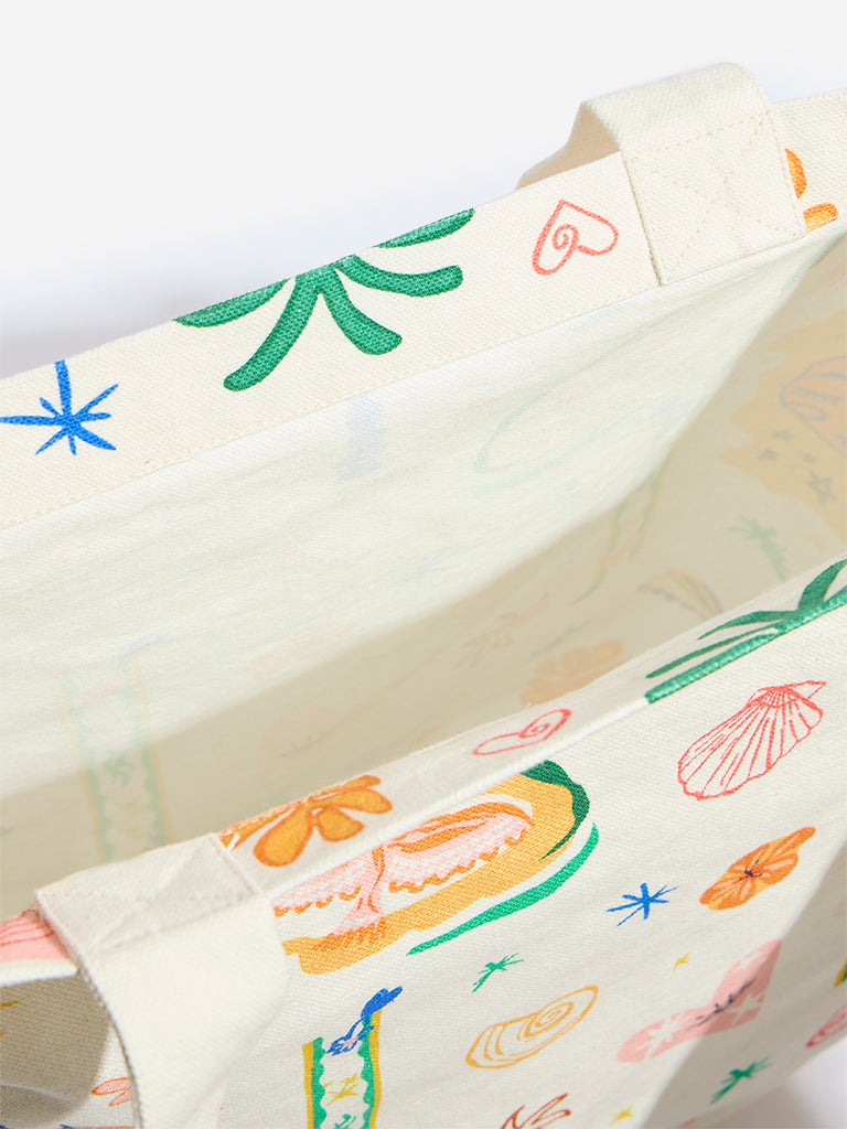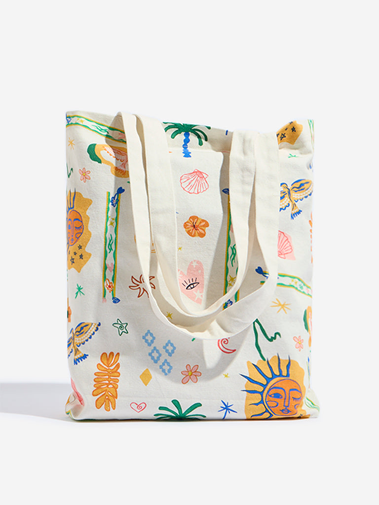Westside presents this beige tote bag. featuring vibrant multi colour prints for a stylish touch. Designed with sturdy attached top handles. it offers a spacious interior. making it a perfect blend of fashion and functionality for everyday use.
