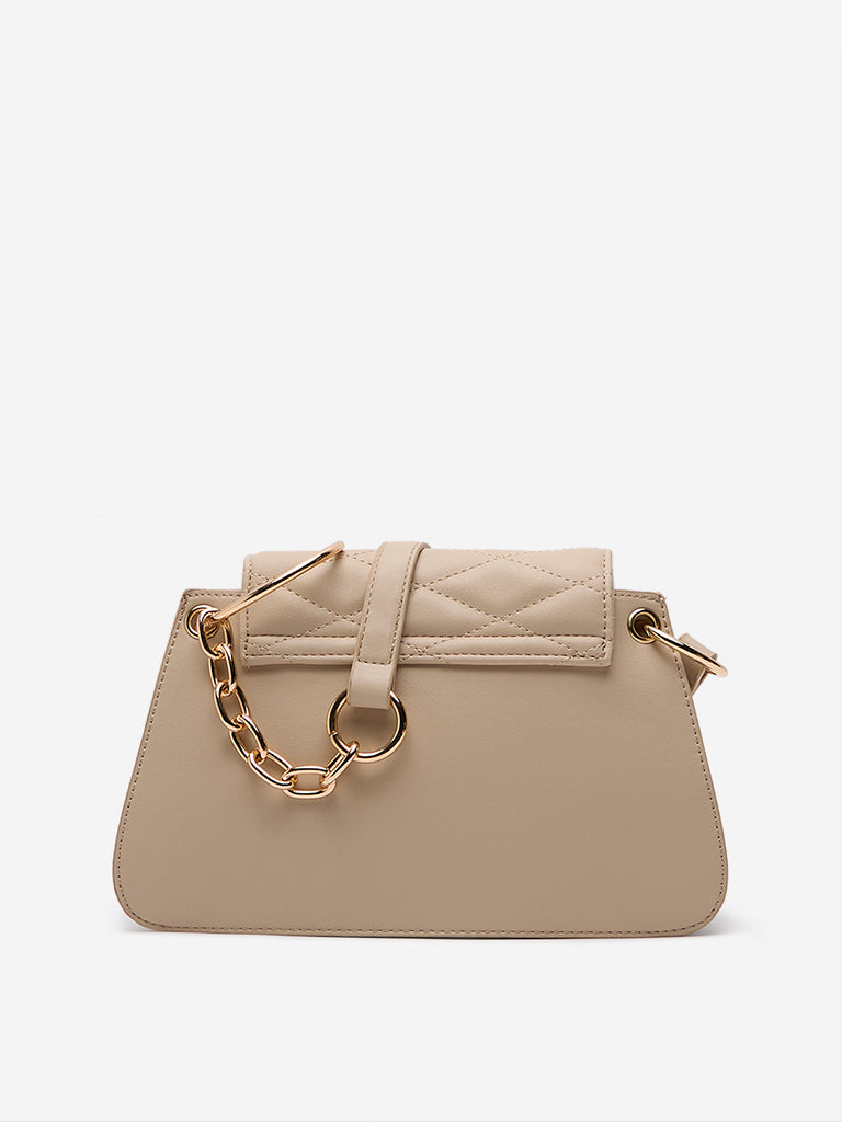This shoulder bag by Westside is offered in beige. Its plush quilted texture in the overflap adds a touch of luxury. while the spacious interior ensures you have plenty of room for your essentials. The bag has a single compartment secured with a gold-toned zipline. Its shoulder strap is designed with a combination of chains that elevate its overall appeal.