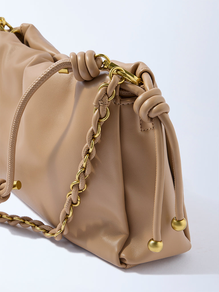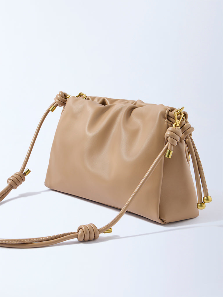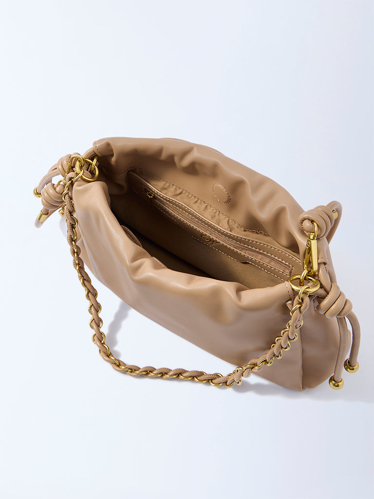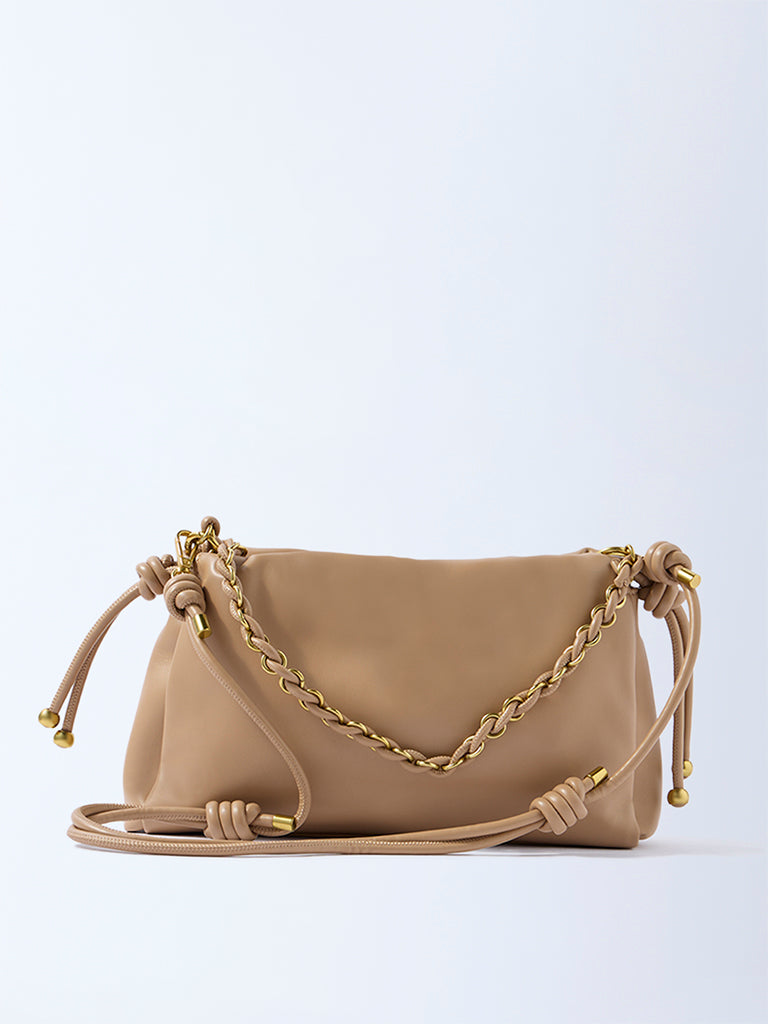 Elegant and versatile. this beige sling bag from Westside brings a refined touch to any ensemble. Crafted from smooth faux leather. it features a softly gathered design with a gold-toned chain strap and knotted drawstring sides. The detachable sling handle allows for easy transitions from day to evening styling.