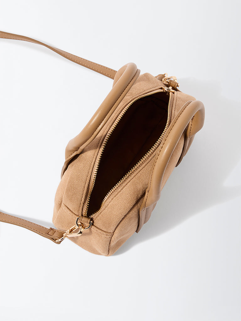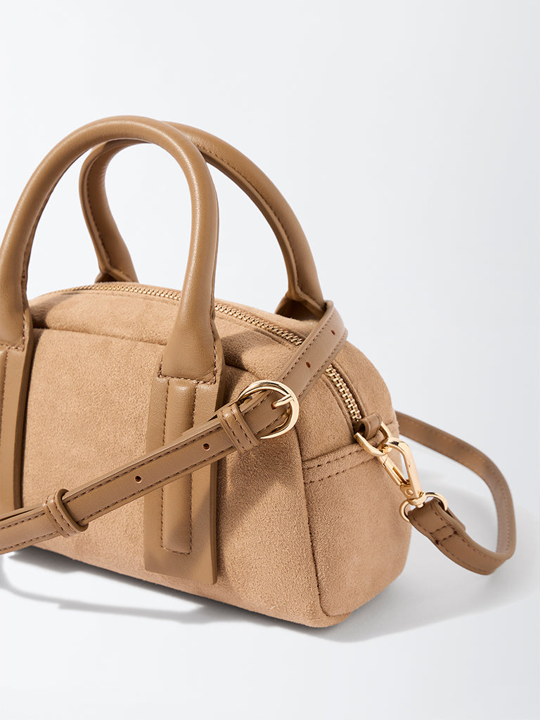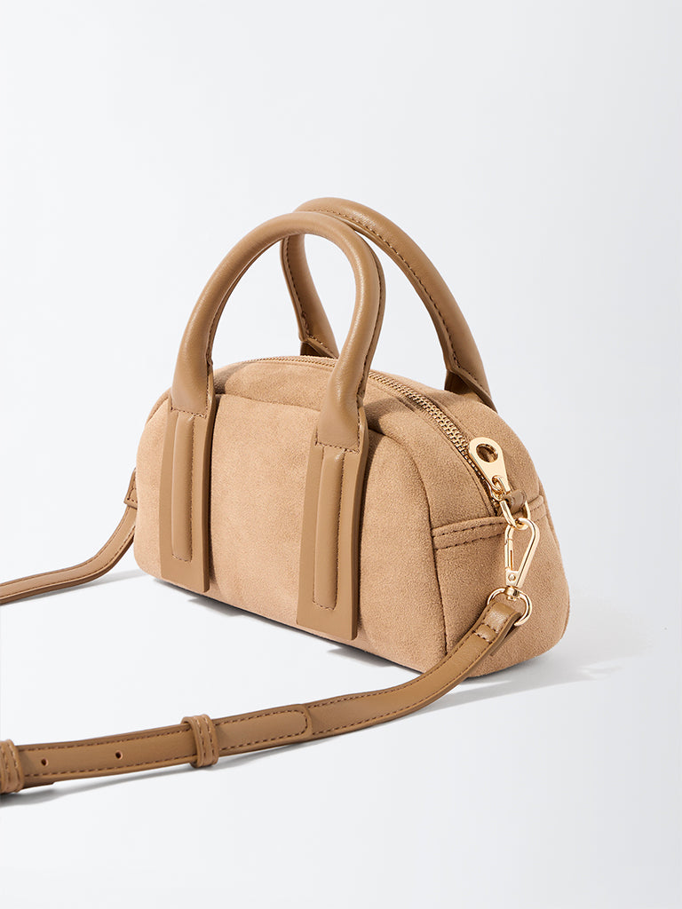 Westside introduces this beige bowling bag. a blend of modern structure and soft texture. Crafted from plush faux suede. it features sturdy top handles and a detachable shoulder strap for effortless versatility. The roomy ziplined compartment ensures space for all your daily must-haves. keeping style and practicality in perfect balance.