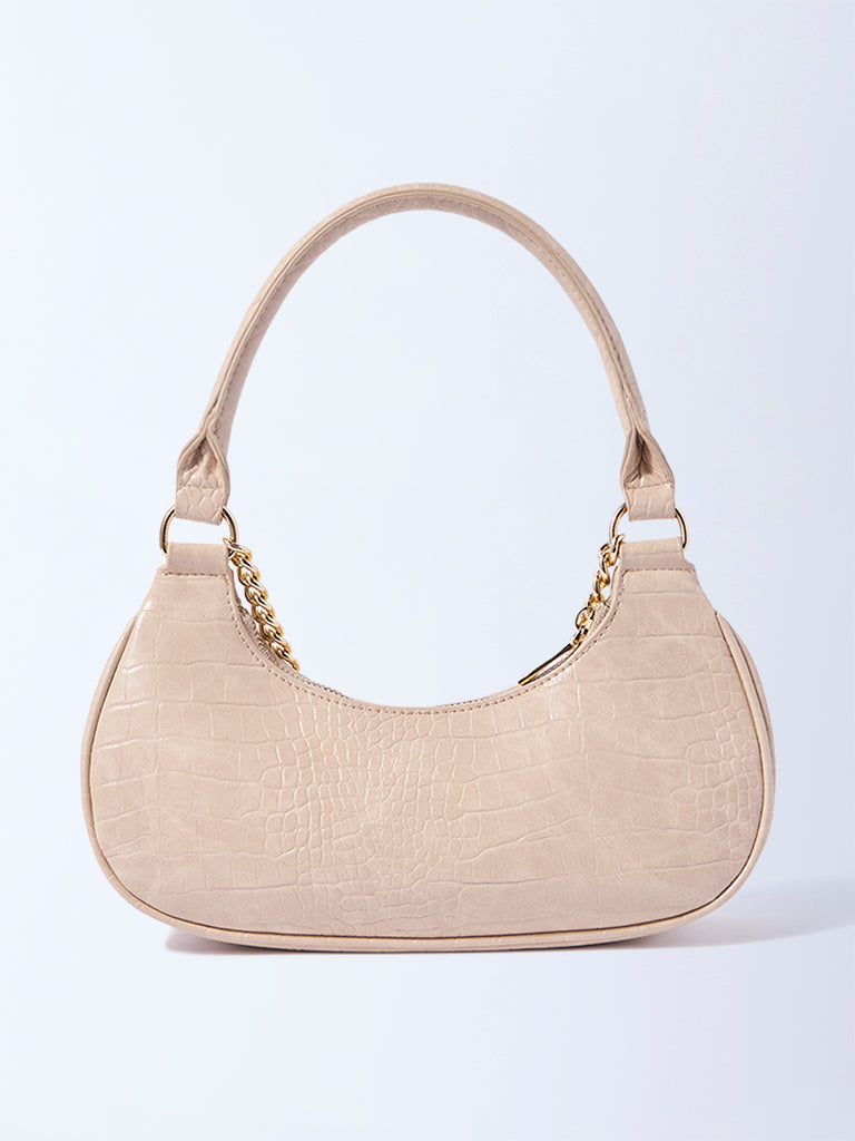 For moments that call for quiet drama. reach for this beige shoulder bag from Westside. The curved silhouette is refined yet statement-worthy. thanks to its embossed crocodile texture and bold gold-tone chain detail. Designed to slip seamlessly into your daily rotation. it balances structure with softness??and has just enough room for the essentials that keep you moving.
