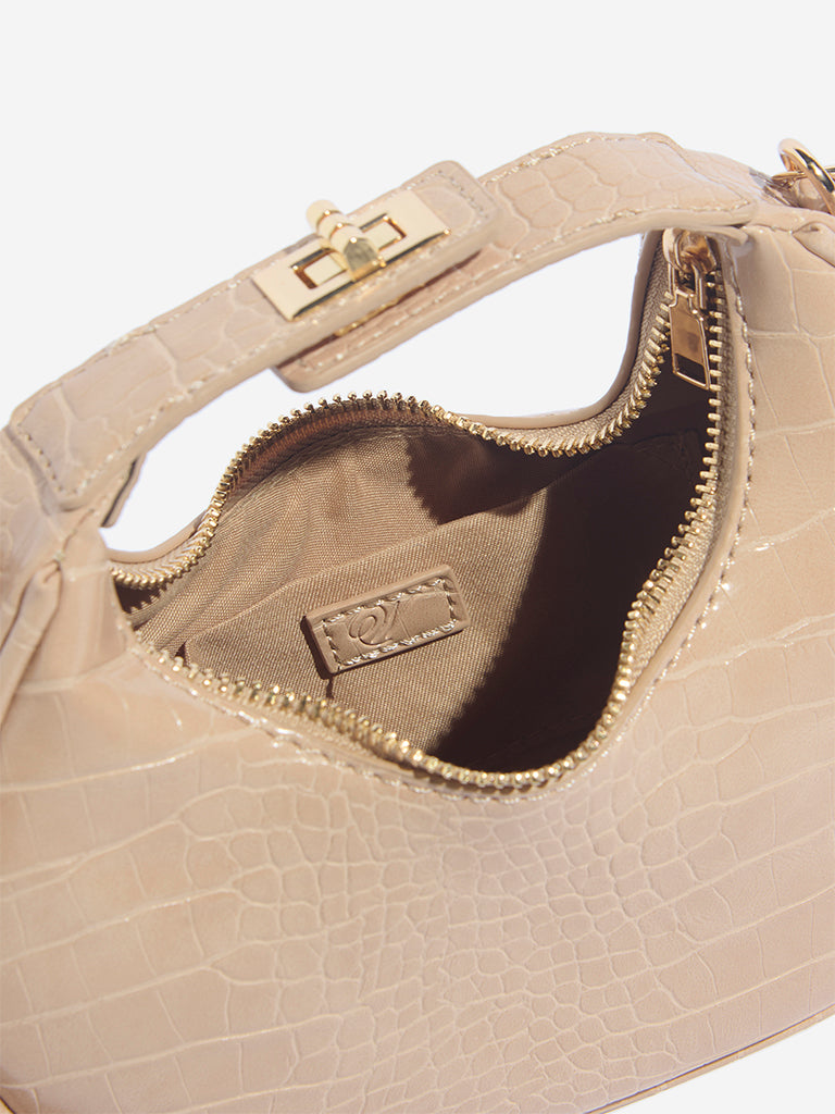 Add a polished touch to your look with this beige sling bag from Westside. Crafted from a croc-textured PU leather. it features a sleek crescent silhouette that brings a modern edge to any outfit. The design includes a gold-toned chain strap and a matching lock detail on the handle for added charm. Finished with a secure zip closure. this compact piece is perfect for both day and evening wear.