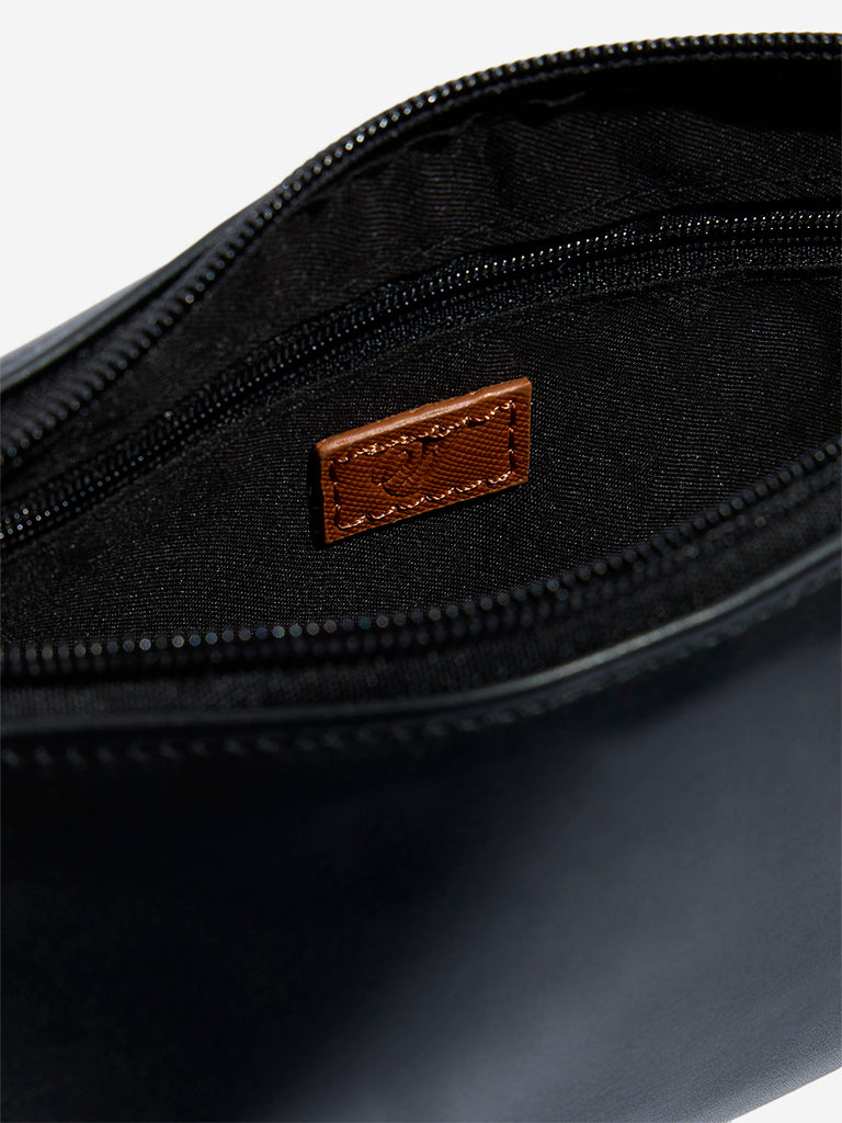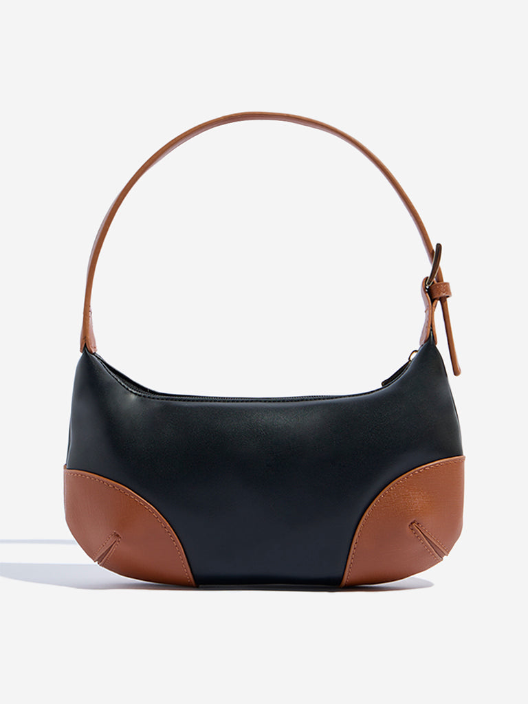 Refine your daily style with this black shoulder bag from Westside. shaped in a sleek. rounded silhouette for a contemporary look. Contrasting brown accents along the sides and a coordinated strap with a gold-tone buckle lends a subtle edge. Fitted with spacious interior and a secure zip pocket. this design adds refined contrast to both polished and casual outfits.