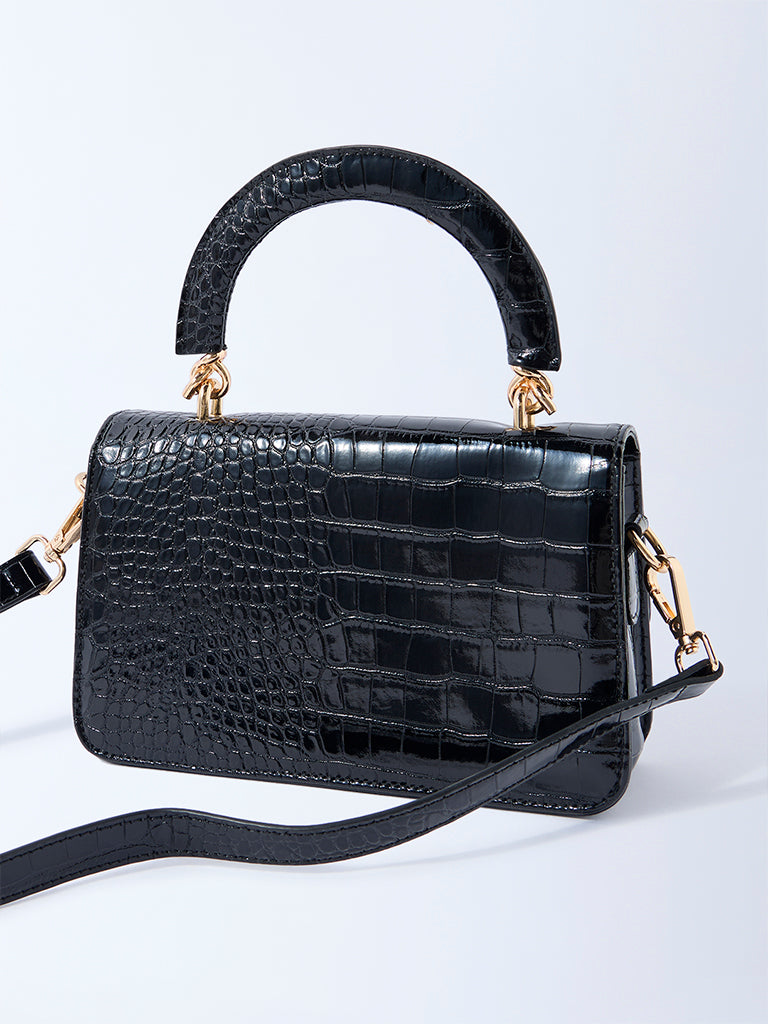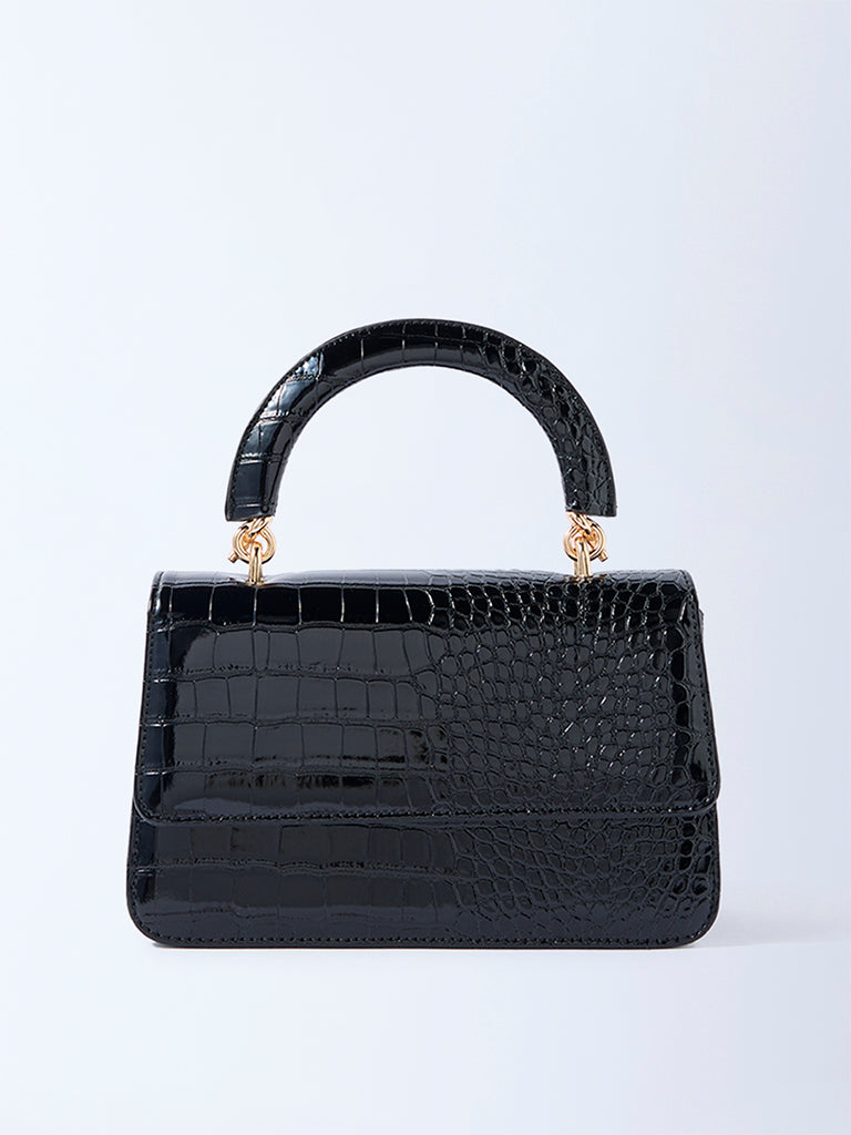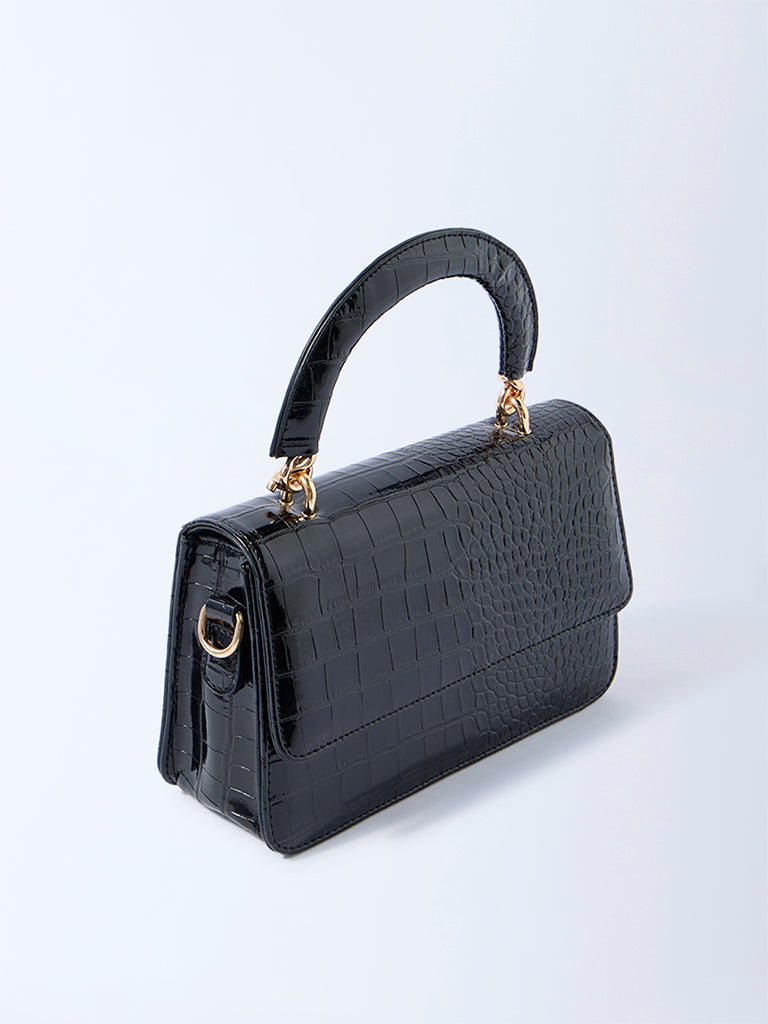 Revamp your off-duty capsule with this black structured bag from Westside. Crafted with a croc-effect finish. it delivers a polished and contemporary edge to any ensemble. The sleek silhouette is complemented by a curved top handle and detachable strap. offering versatile styling options whether carried in hand or slung crossbody. Gold-toned hardware lends a refined accent. while the spacious interior with a secure zip pocket keeps essentials organised.