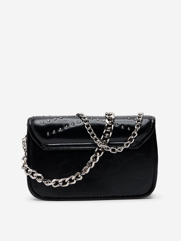 Add a touch of glamour with Westside’s black sling bag. The square shape and intricate embellishments make it a standout piece. while the flap closure ensures your belongings stay secure. With a compact design and strong chain sling. it’s perfect for both style and convenience.