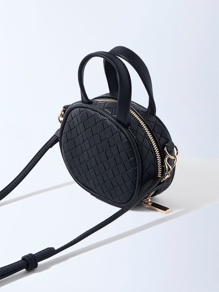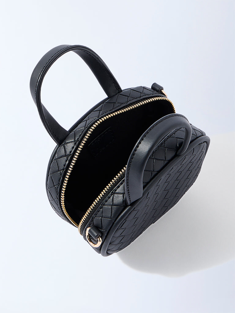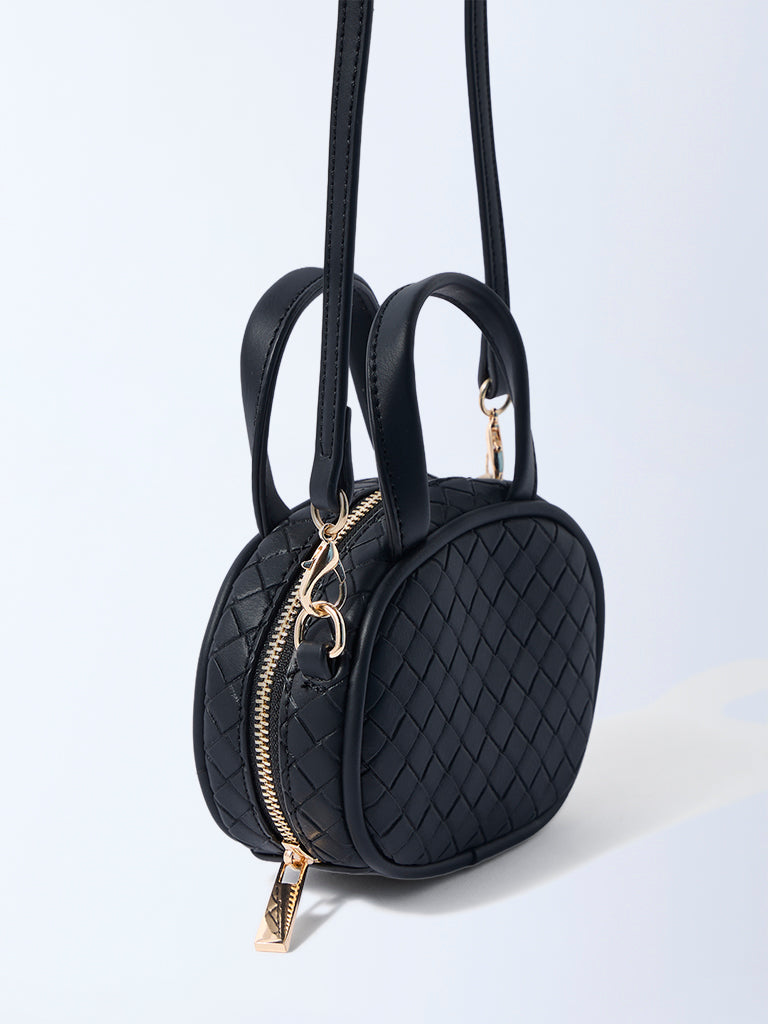 Compact sculpted and distinctly refined this black sling bag from Westside makes a case for modern minimalism. The oval silhouette is detailed with a quilted weave texture that adds depth and dimension to its smooth frame. Twin top handles and a detachable strap offer multiple carry options while the gold zip closure lends a sleek accent. Thoughtfully proportioned for just the essentials it’s a versatile piece that elevates everyday dressing with quiet sophistication.