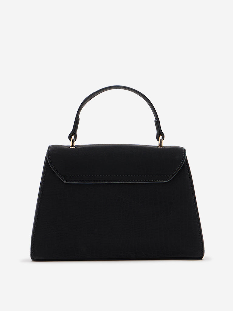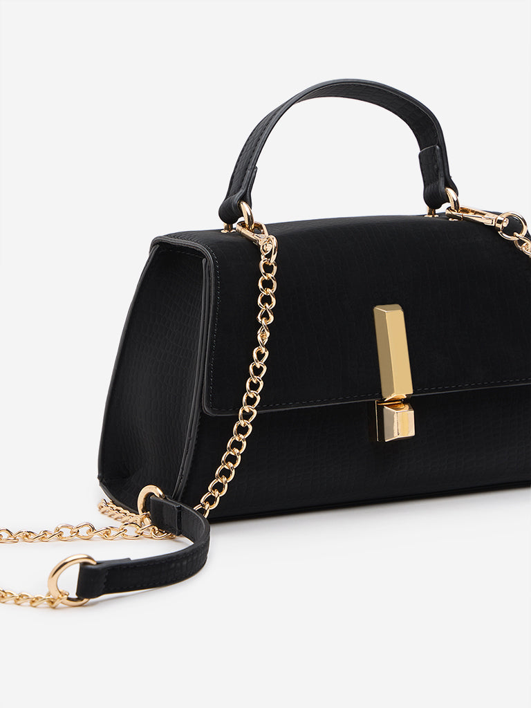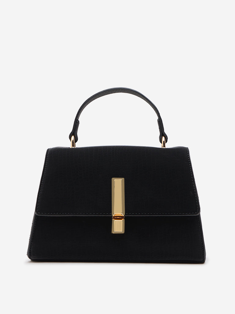 This black sling bag by Westside exhibits a reptilian design. A faux-suede finish adds an elegant touch to this modish bag accentuated by a gold accent metallic closure. It has good space for containing your daily essentials.