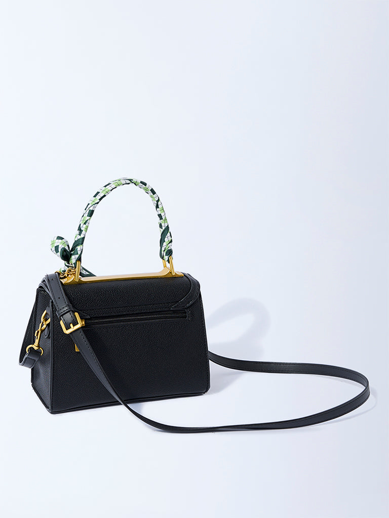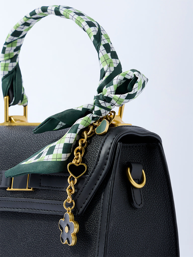 Chic and effortlessly versatile. this black satchel from Westside is the perfect blend of polish and personality. The textured finish exudes sophistication. while a green-and-white checkered scarf tied to the top handle adds a playful. trend-forward twist. Finished with a gleaming gold charm. it’s the kind of bag that elevates everything from weekday tailoring to weekend denim.