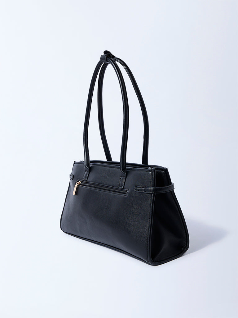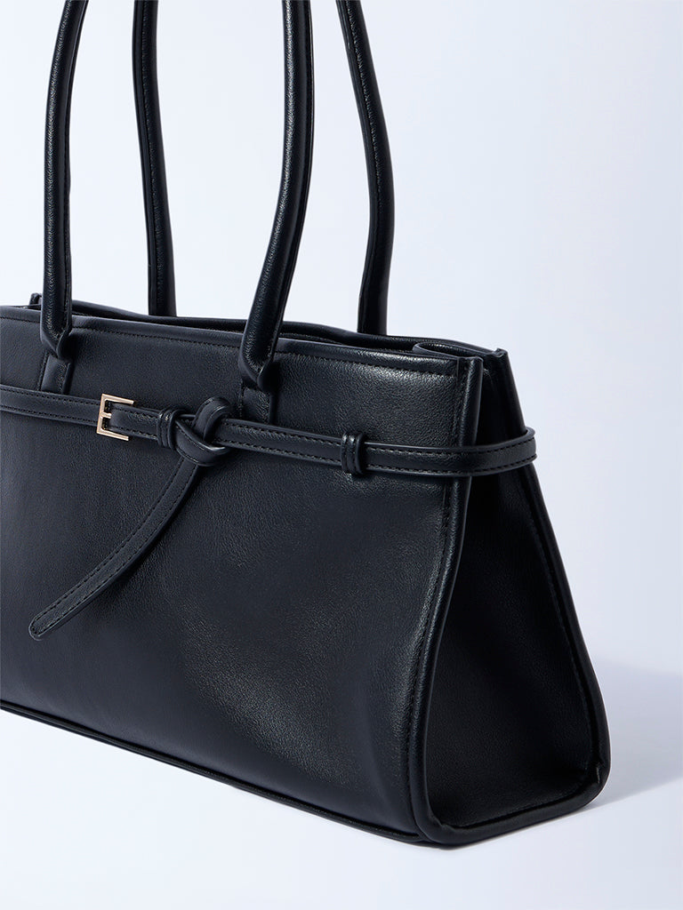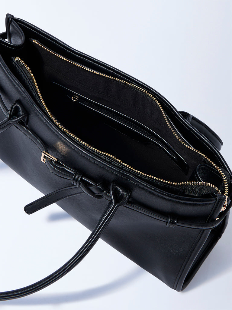 This black satchel bag from Westside is made for the woman who loves quiet sophistication. The sleek silhouette is elevated with a knotted belt detail and subtle gold hardware. giving it a polished edge without feeling too formal. Inside. multiple compartments keep everything organized. making it as functional as it is elegant.