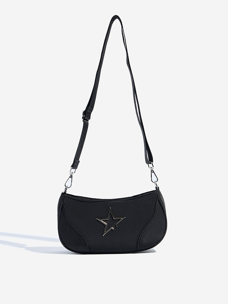 This black sling bag from Westside stands out with a charming star detail that enhances its sleek. curved shape. Equipped with a slim. adjustable shoulder strap. it offers flexible styling options??wear it crossbody for hands-free convenience or over the shoulder for a classic look. Inside. the spacious compartment keeps your essentials organized.