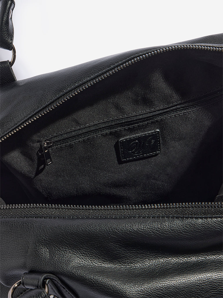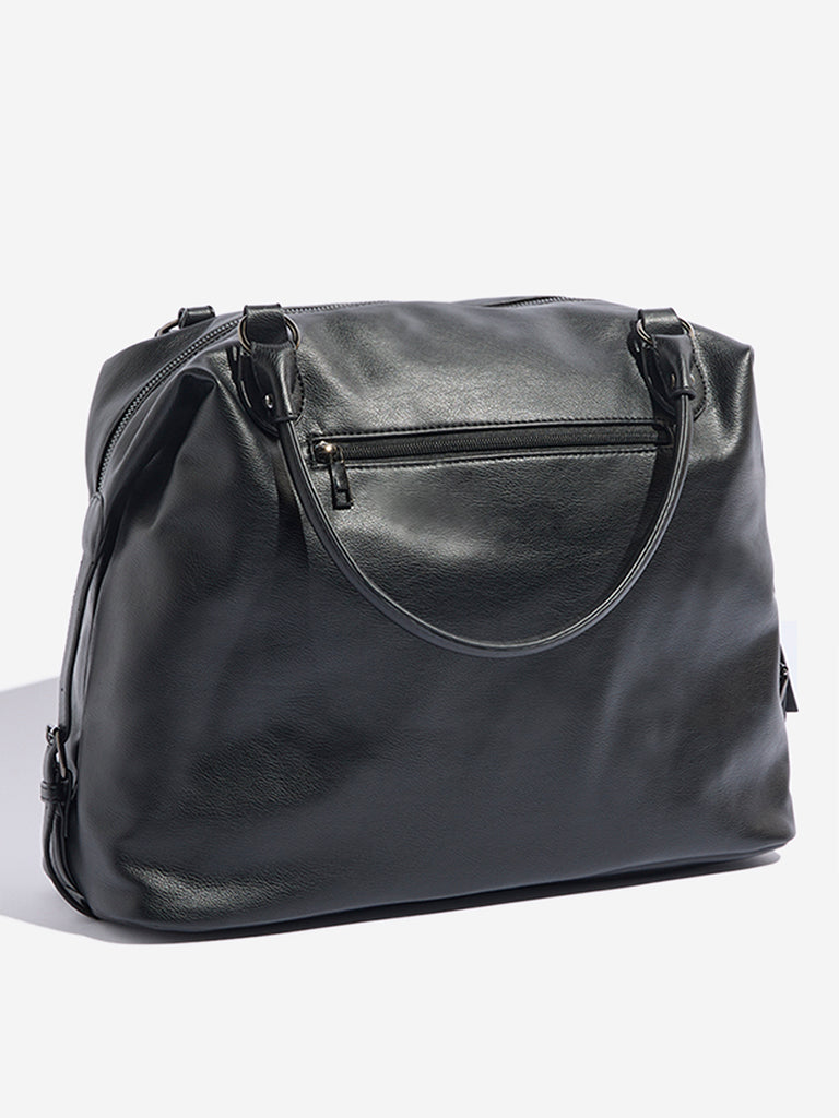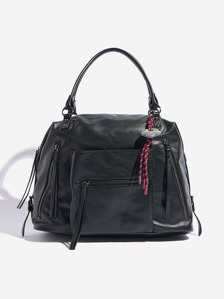 Westside presents this stylish black tote bag crafted from smooth soft. slightly slouched silhouette. Subtle vertical paneling adds shape and dimension. while a tonal multi-strand tassel detail brings a touch of relaxed elegance. Designed with practicality in mind. it features a top zip closure. a front slip pocket for easy access. and additional zippered compartments on both sides. Belted strap accents on either side complete the look. making this tote a versatile choice for everyday style.