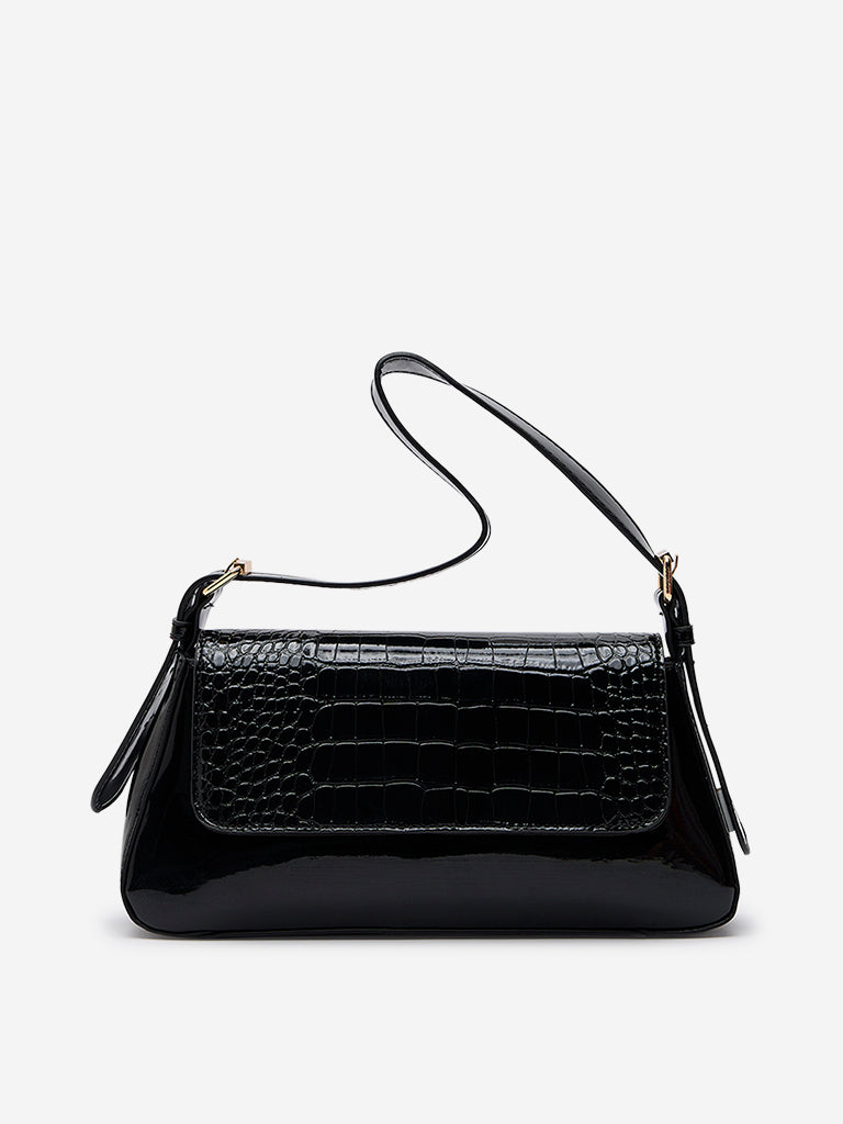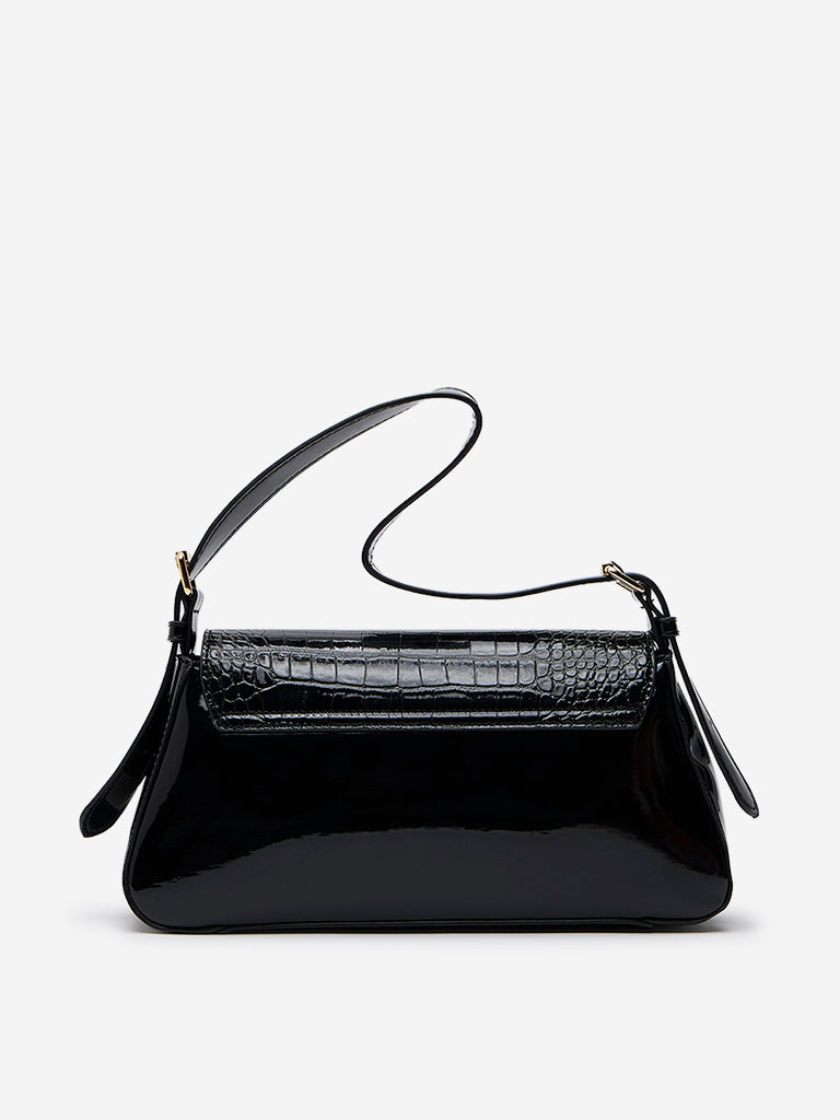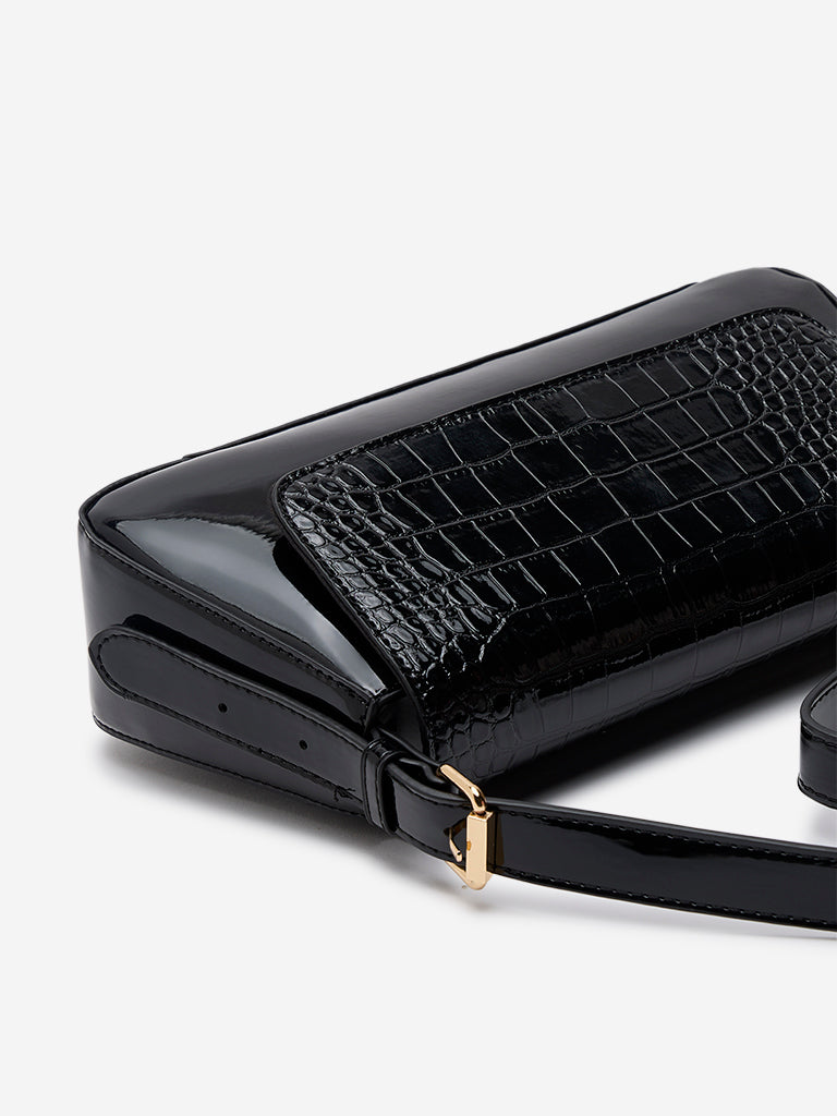 Stay chic with Westside’s black faux-leather shoulder bag. The textured flap closure adds a stylish touch to its compact design. Featuring a spacious interior with multiple pockets. it offers excellent organization. The adjustable strap easily converts it into a trendy baguette-style shoulder bag.