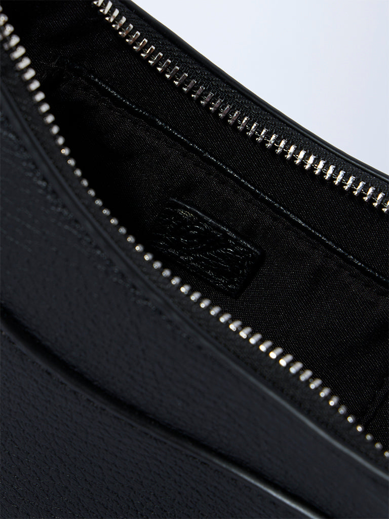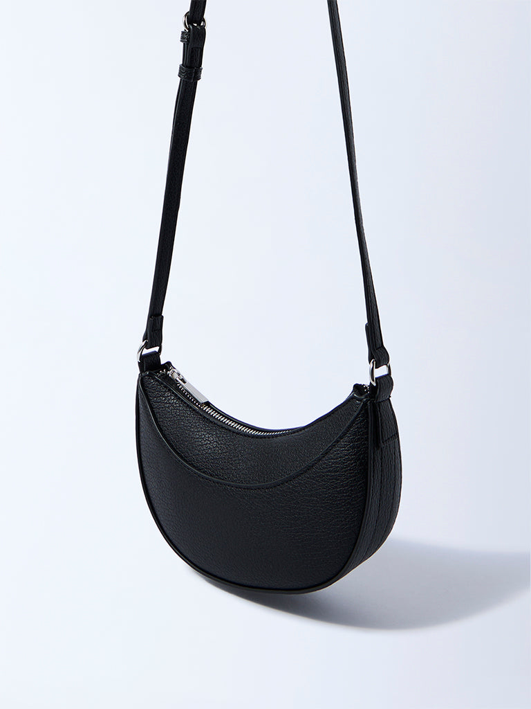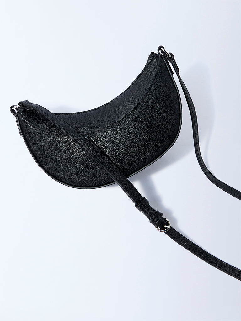 This black saddle bag from Westside merges classic form with modern finesse. The curved silhouette is complemented by a sleek. adjustable strap accented with silver-toned hardware for a subtle edge. Designed with a secure zippered compartment. it offers just the right balance of practicality and polish.