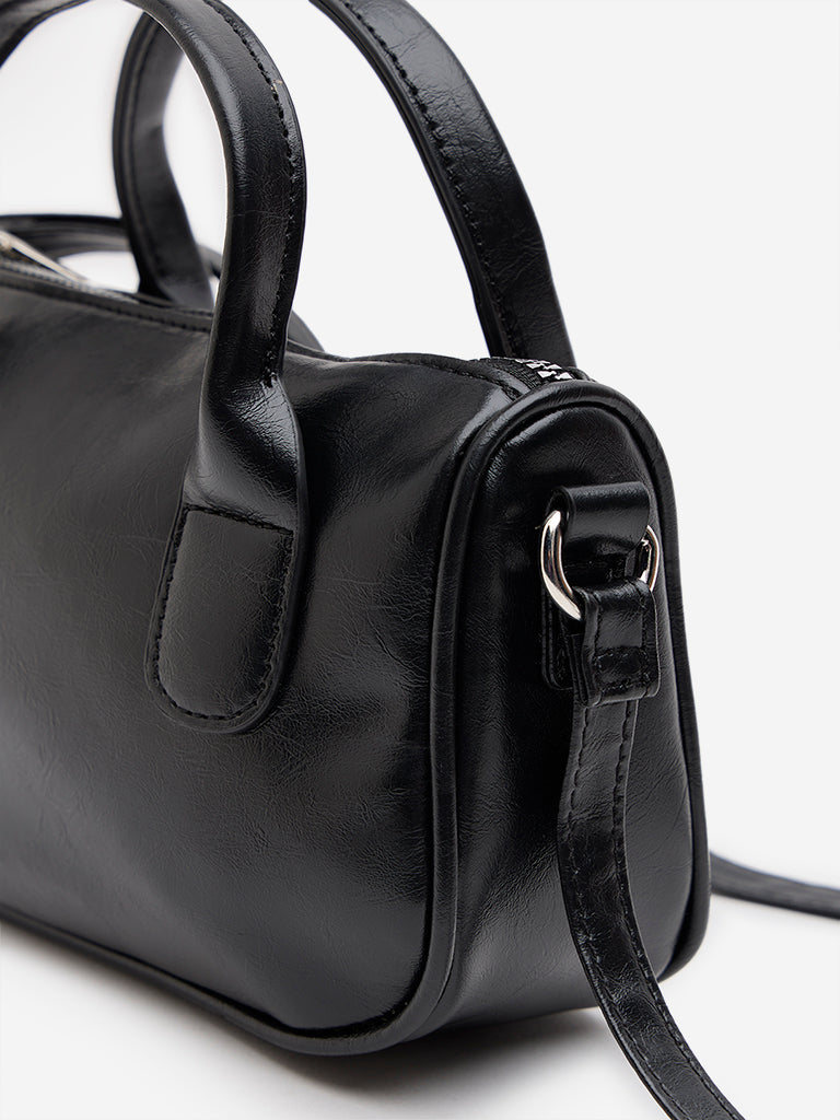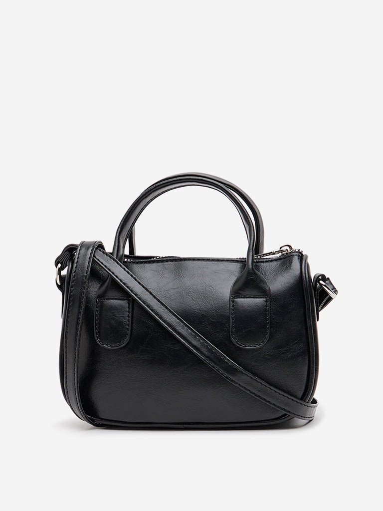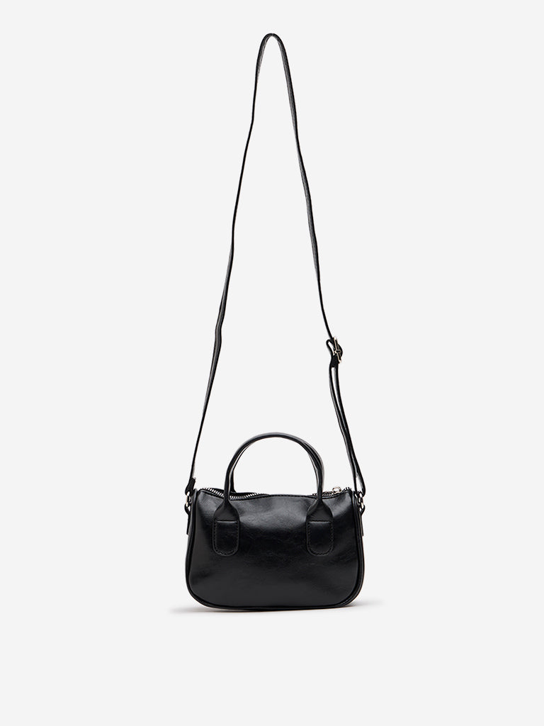 This black mini Sling Bag by Westside showcases a textured finish. It features an adjustable shoulder strap and a zipper closure completing its petite profile.