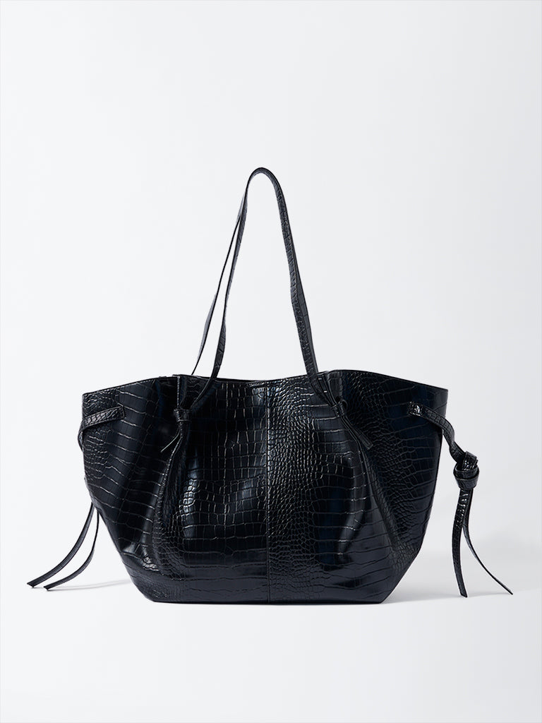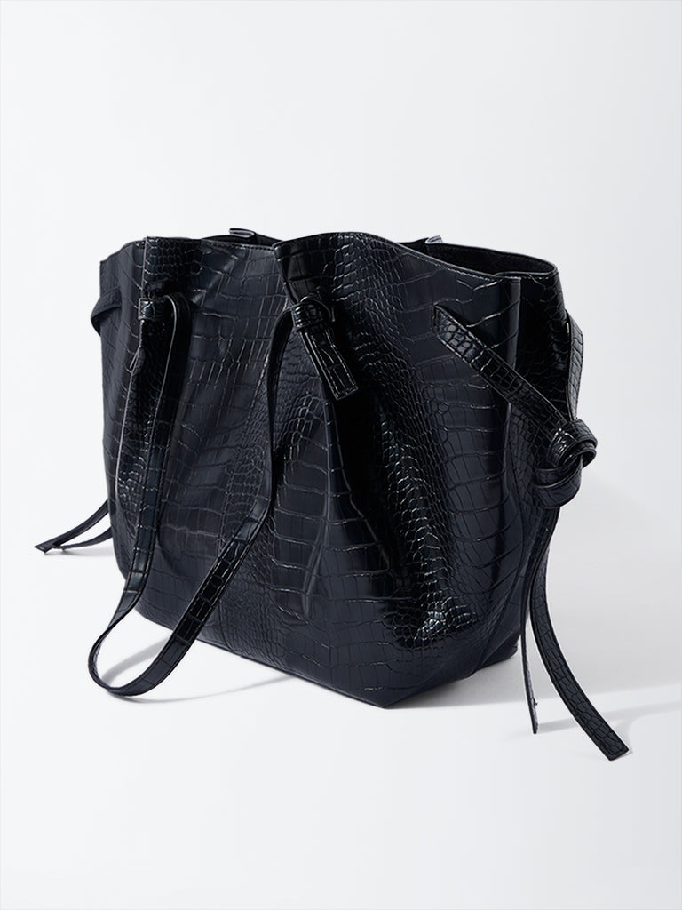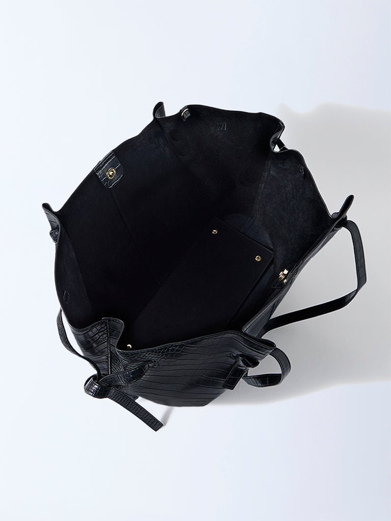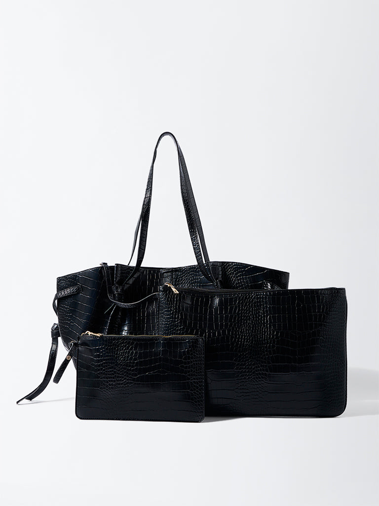 Westside redefines utility with quiet sophistication in this black tote set. Crafted from croc embossed faux leather. it features a structured rectangular silhouette with a flat base. dual top handles and a sleek open top design. The set includes a padded laptop sleeve and a matching zip pouch for smaller essentials. both styled in the same texture for cohesion. Subtle gold hardware and tonal stitching give it polish. making it the perfect workday companion that balances elegance and efficiency.