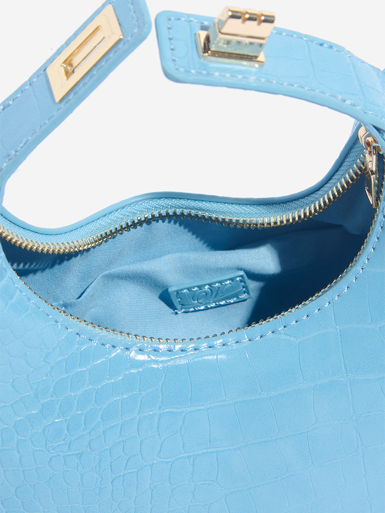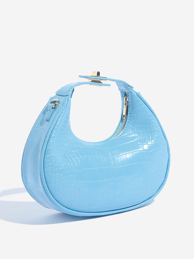 Infuse your look with a pop of colour with this blue sling bag from Westside. Crafted from croc-textured PU leather. it’s shaped in a chic crescent silhouette that brings a playful charm. The metallic chain strap and gold-toned lock on the handle add subtle shine. and the zip closure keeps things practical. A fresh pick for stylish everyday wear.