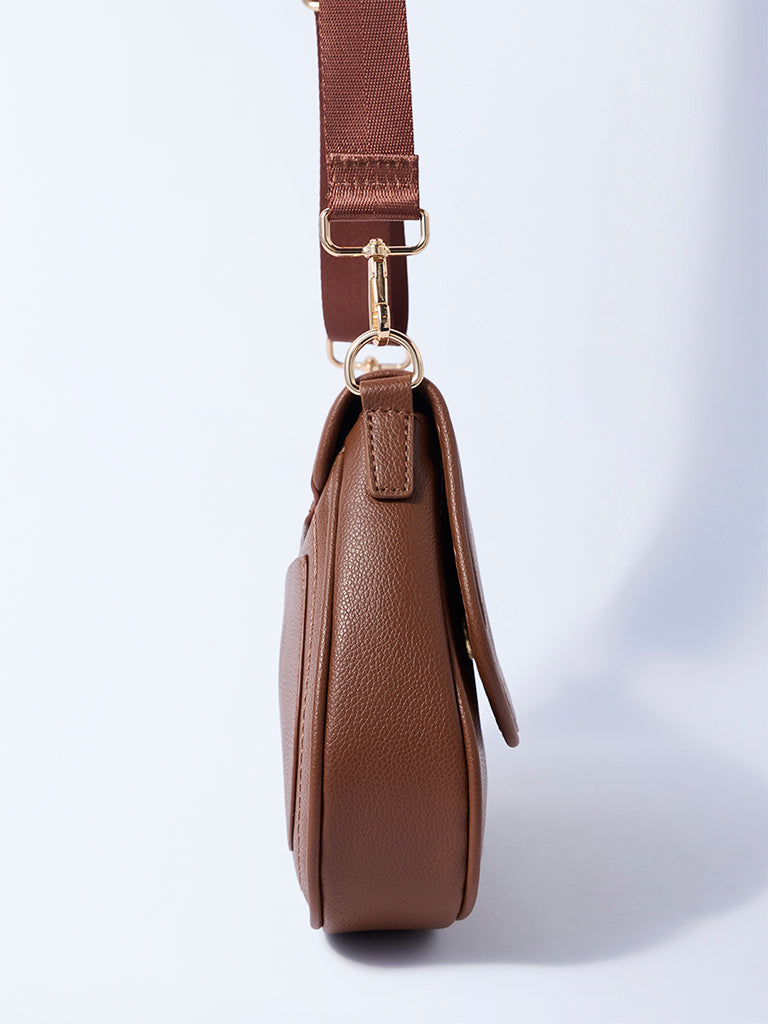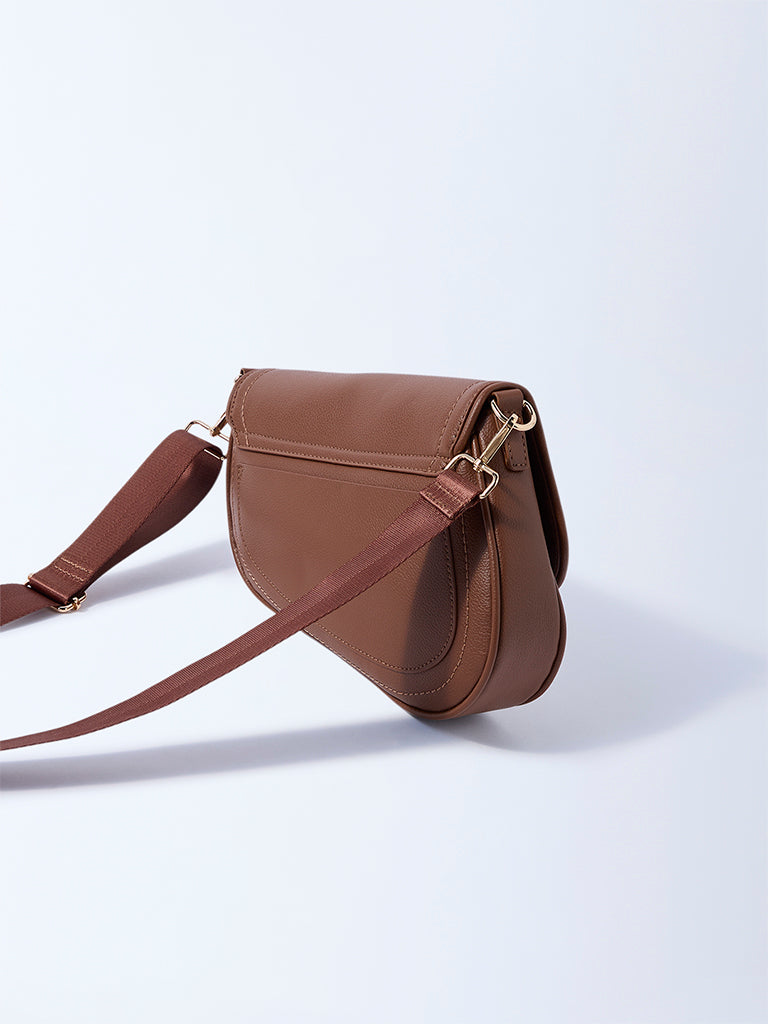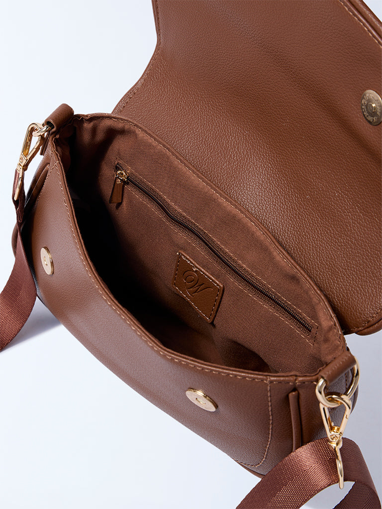 This brown asymmetric sling bag from Westside is that effortless piece you’ll reach for every day. The sleek saddle silhouette gives it a modern yet timeless feel. while the gold hardware and smooth finish add just the right touch of polish. A wide strap keeps it comfortable for all-day wear. and the magnetic flap opens to reveal space for your phone. cards. and keys.