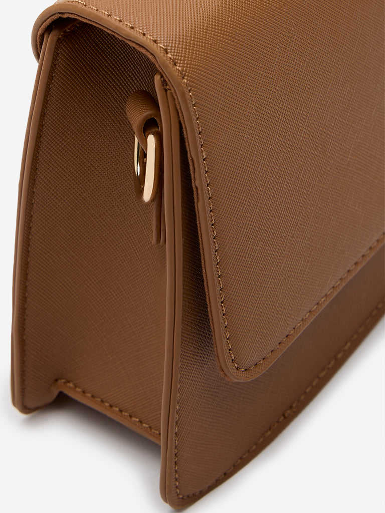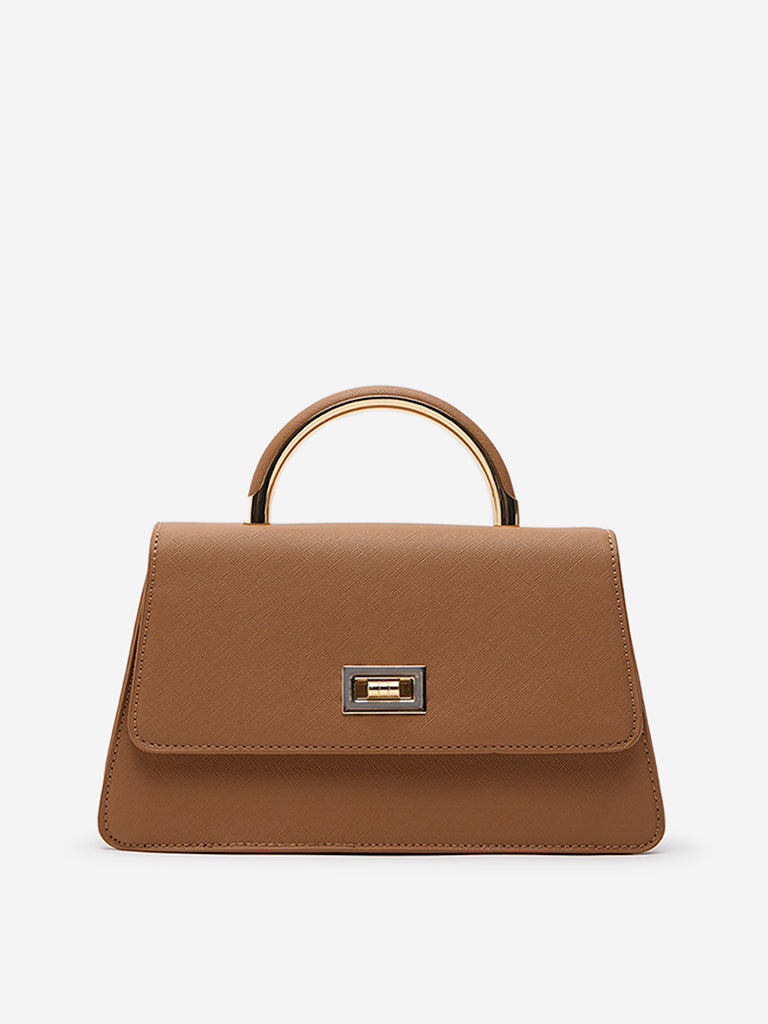 Westside presents this compact brown hand bag styled with an overflap design. It has a spacious single compartment offering practicality for your essentials while the distinctive semi-circular metal handle adds a modern twist.