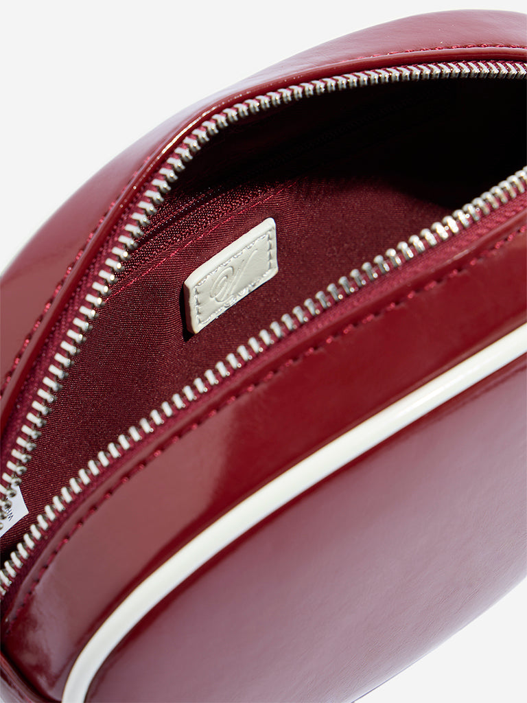 Amp up your accessory collection with this burgundy capsule sling bag from Westside. showcasing a sleek. compact silhouette. The glossy. patent-like finish with the contrast white piping along the edges exudes understated elegance. enhancing its visual appeal. It is finished with a slender. adjustable sling strap. to be carried crossbody or draped elegantly over the shoulder.