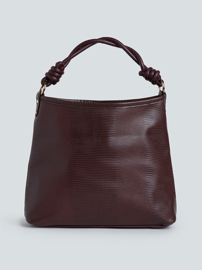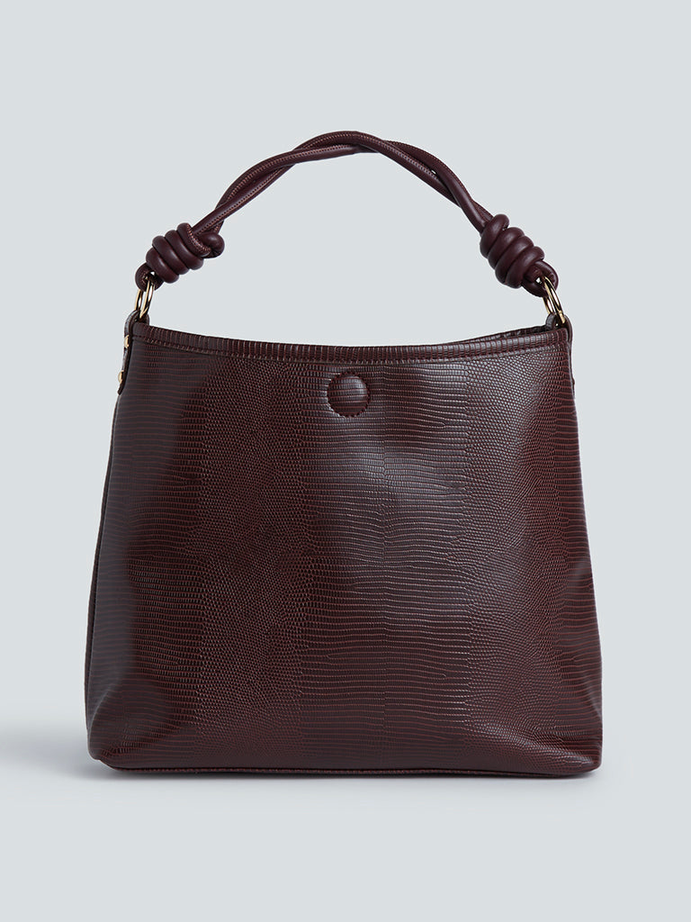 A classic retake on a timeless piece. this burgundy sling bag from Westside is a noteworthy investment. Cut in a faux-leather profile. this roomy creation comes designed with a single yet spacious compartment that features a metallic buckle closure for modernity.