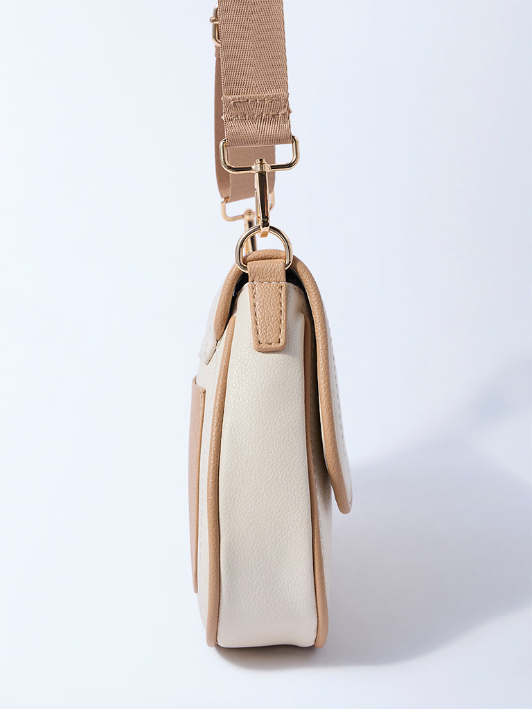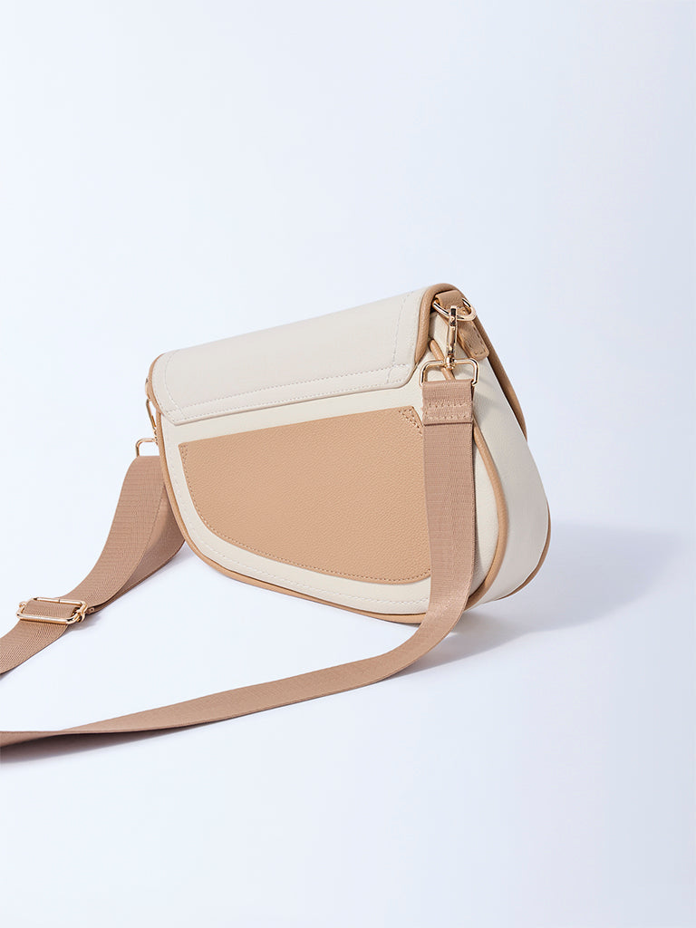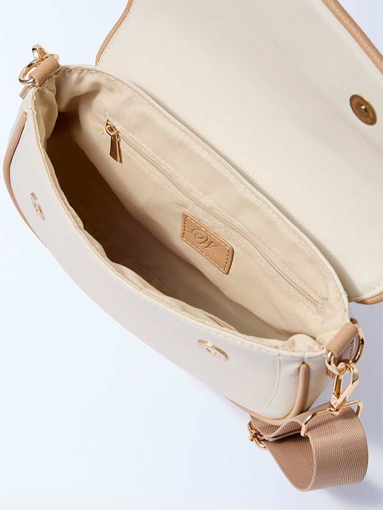 Designed to feel as effortlessly put-together as you are. this cream asymmetric sling bag by Westside features a smooth curved silhouette and refined tan trim for subtle contrast. The magnetic flap opens into a well-organised interior that fits your day-to-day essentials. With an adjustable strap for shoulder or crossbody wear. it’s the bag you’ll grab on busy mornings. midday meet-ups or relaxed evenings out.