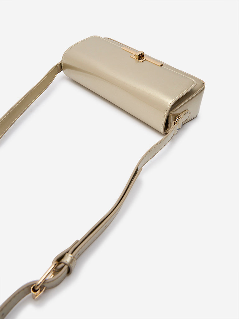 Add a touch of glamour with Westside gold faux-leather sling bag. The sleek design is complemented by a flap closure and a gold-toned metal-accent lock. Adjustable shoulder straps and a spacious interior make it a perfect blend of style and functionality.