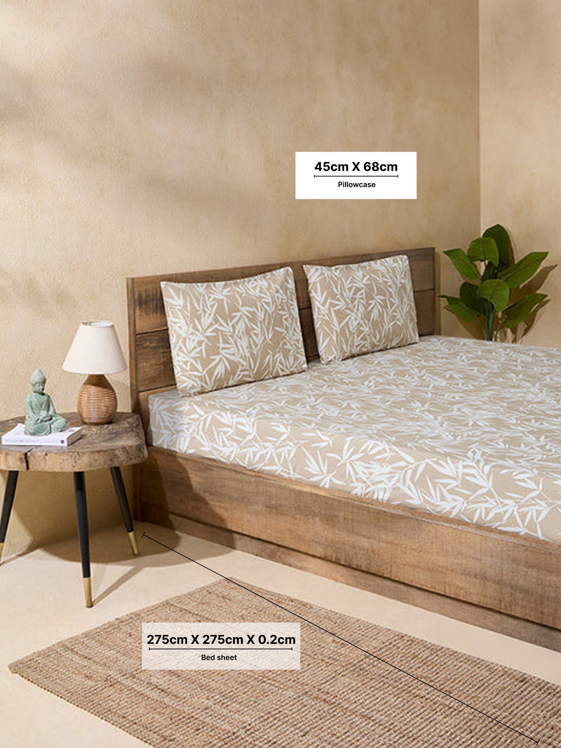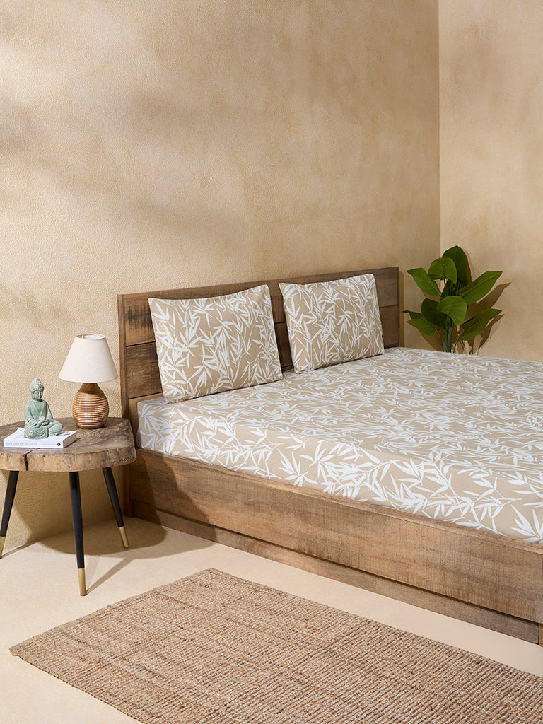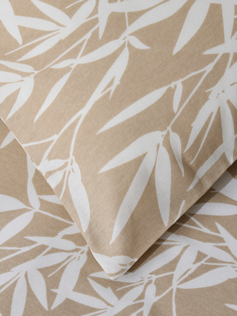 Westside Home Beige Leaf Design King Bed Flat Sheet and Pillowcase Set