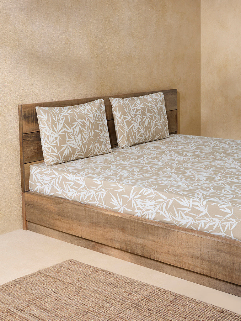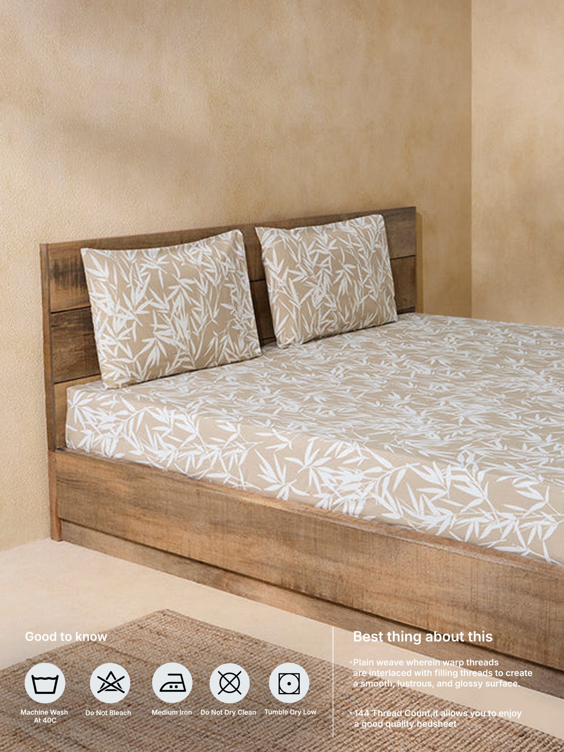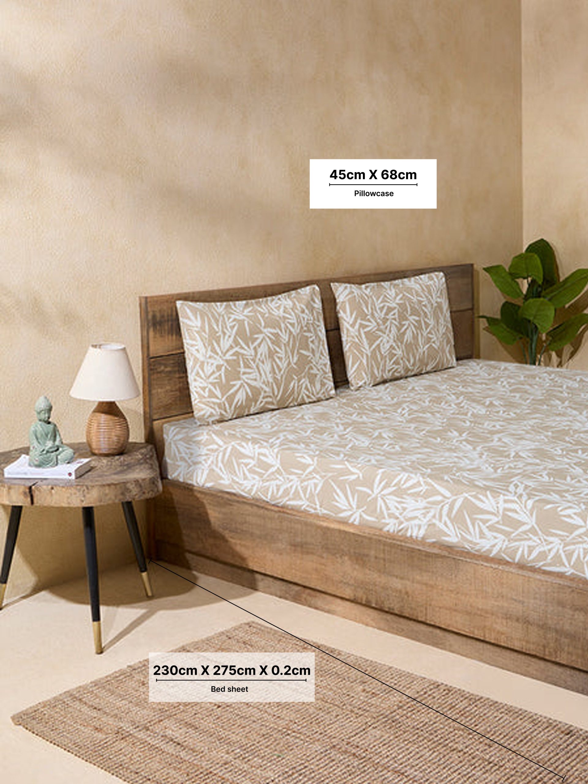 Westside Home Beige Leaf Design Queen Bed Flat Sheet and Pillowcase Set