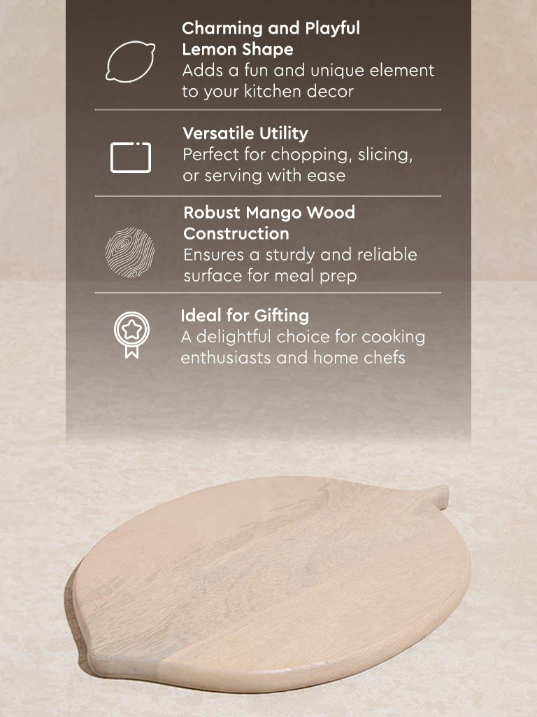 Add a playful yet functional piece to your kitchen with this beige chopping board from Westside Home. Crafted from premium wood. this charming board is designed in the shape of a fresh lemon. making it a perfect mix of practicality and whimsy. Ideal for chopping. slicing. and serving. its sturdy surface ensures precision while prepping your meals. The lemon design adds a touch of fun to your kitchen. making it a great gift for cooking enthusiasts or anyone looking to brighten their countertop with a touch of personality.