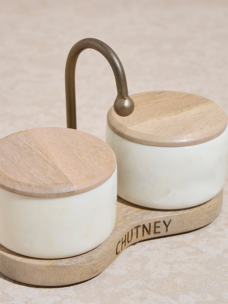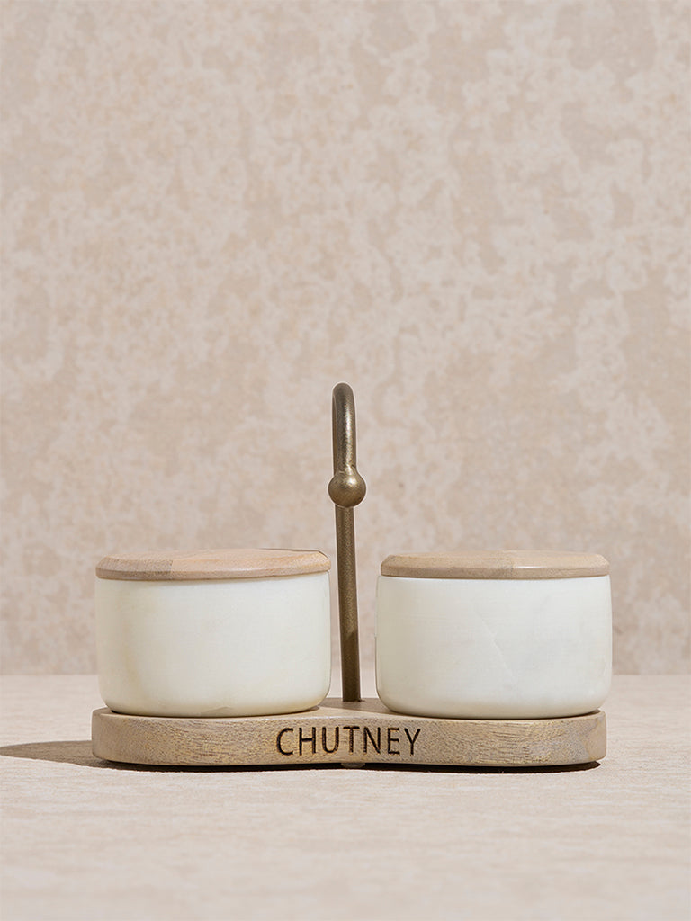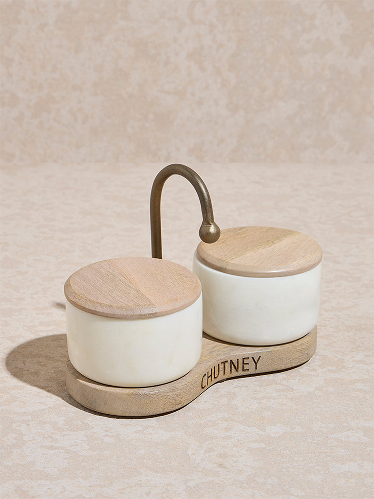 Revamp your dining presentation with this set of two chutney bowls from Westside Home. Each bowl is crafted from exquisite beige marble. paired with sleek lids and elegantly set atop a sturdy wooden base. This sophisticated set is perfect for serving chutneys. dips. or sauces. adding a refined touch to your table. The natural textures of marble and wood create a harmonious blend of materials. offering both beauty and functionality to enhance your dining experience.