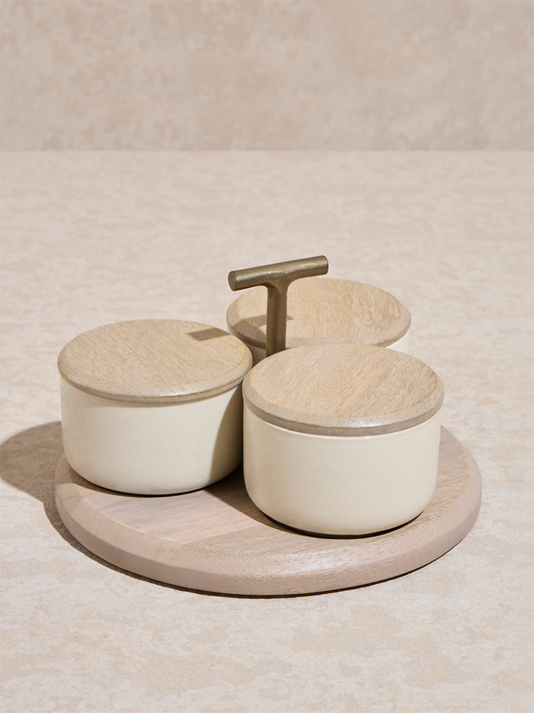 Serve your condiments in style with this set of three chutney bowls from Westside Home. These elegant bowls. crafted from luxurious beige marble and topped with matching lids. rest atop a beautiful wooden base. combining natural materials for a sophisticated look. Perfect for a variety of chutneys. dips. or small snacks. this set brings an upscale touch to your dining table. The seamless blend of marble and wood ensures that every meal feels like a special occasion.