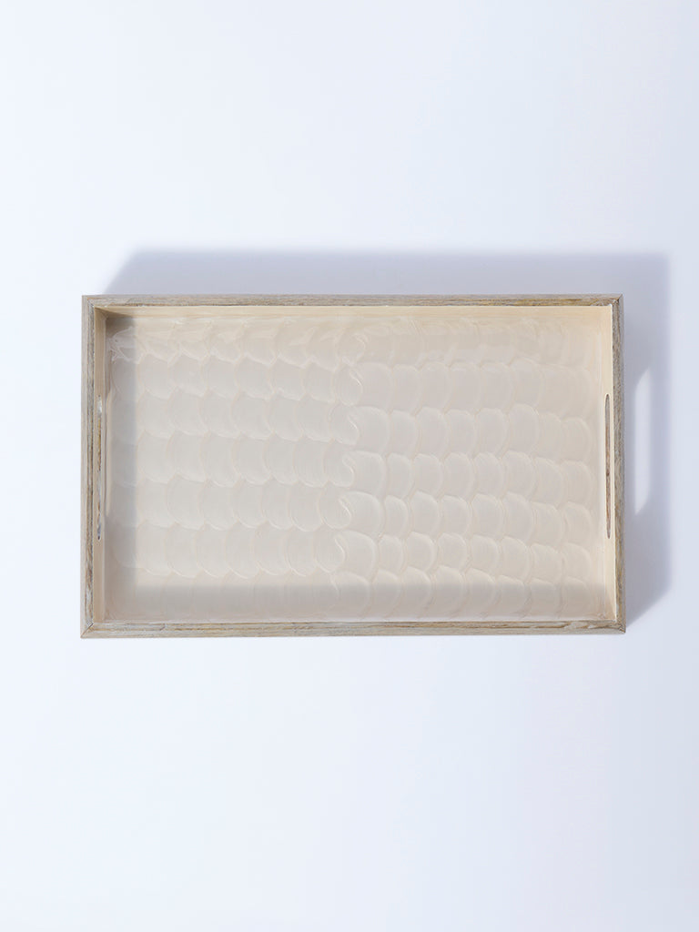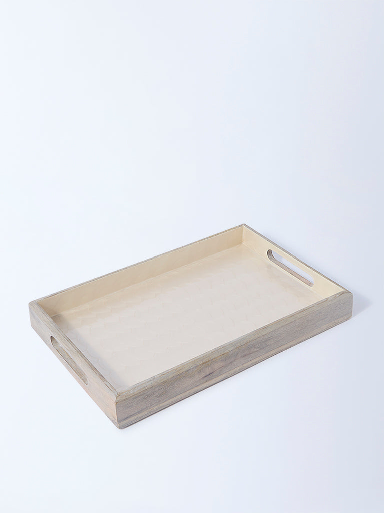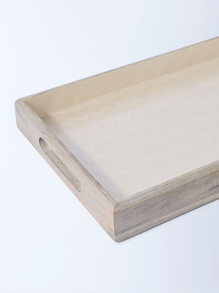 This beige enamel tray from Westside Home features a shell-patterned base set within a pale wooden frame. Designed with side cut-outs for easy grip. it offers a stable surface for carrying or display. The smooth interior is easy to wipe clean. making it suited for everyday use ?? from serving beverages to holding clustered objects on a coffee table or console. Its neutral finish keeps the focus on form and function. Use it to frame a morning coffee setup or anchor loose items in shared spaces.