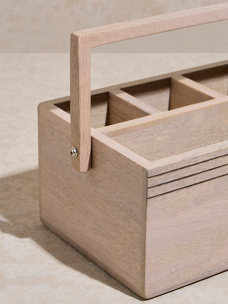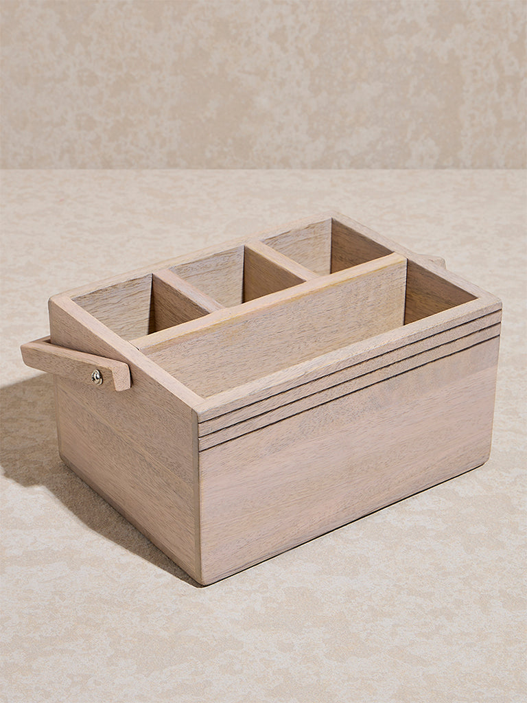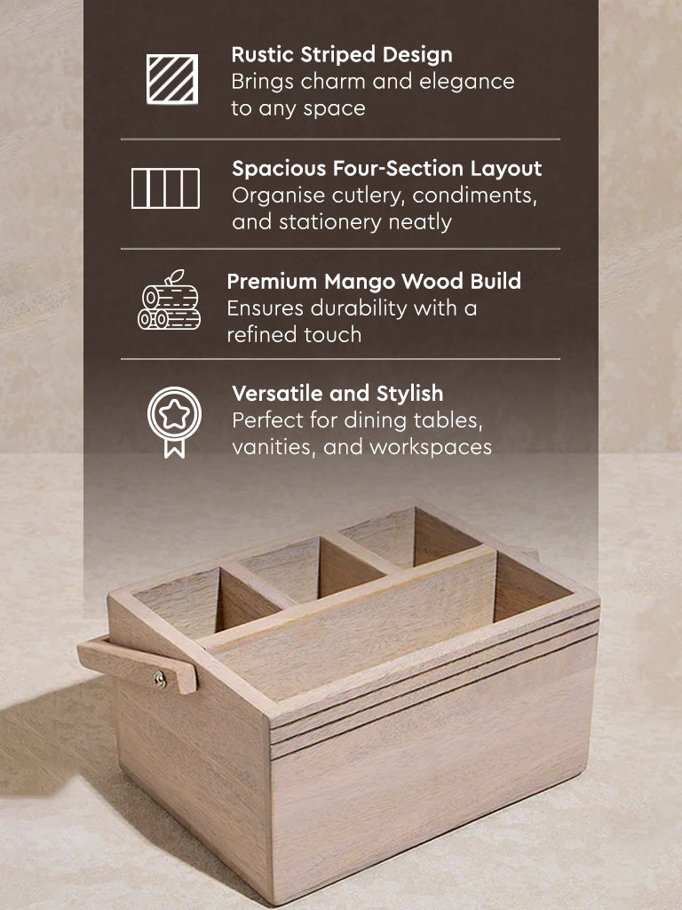 A fusion of function and refined aesthetics. this beige wooden caddy from Westside Home is an effortless organizer for your essentials. Thoughtfully designed with four spacious compartments. it holds everything from cutlery and condiments to stationery and self-care must-haves. The subtle stripe detailing adds a hint of rustic charm. making it a stylish addition to dining tables. vanities. or workspaces. Whether hosting a gathering or decluttering your space. this caddy is a versatile companion that blends practicality with understated elegance.